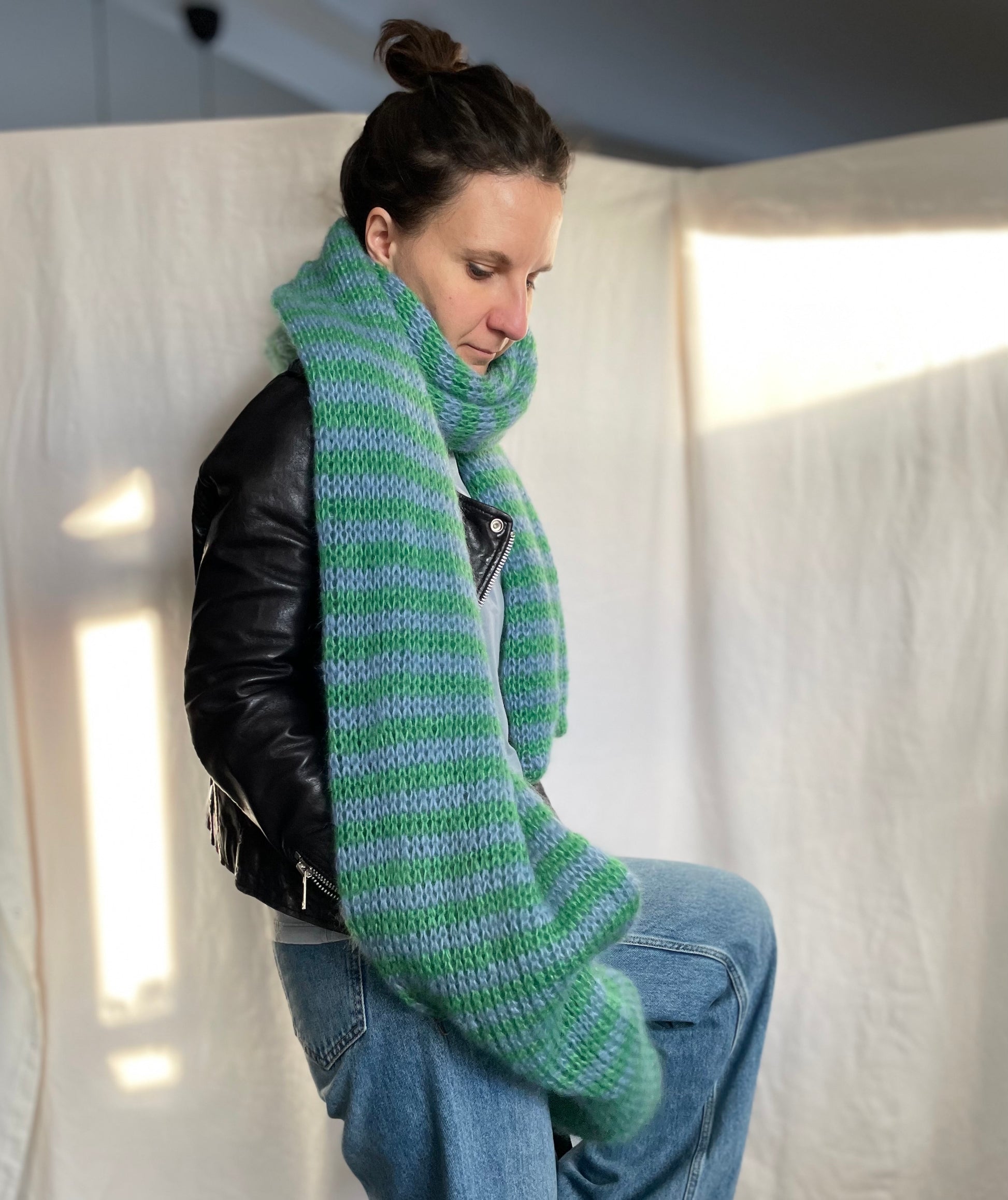 Hand knitted long and bulky scarf made from luxurious mohair silk blend (75% mohair, 25% silk) yarn in two colours: blue and green. It is double layered, very warm, soft and lightweight. Wrapping in it will give you a feeling of cosiness and relaxation.