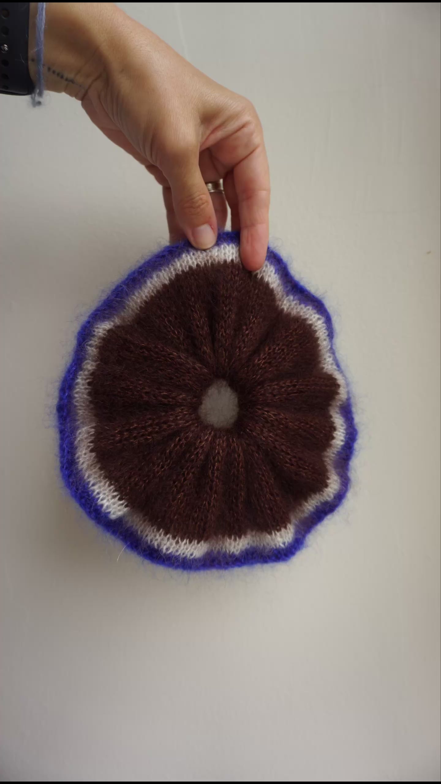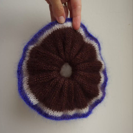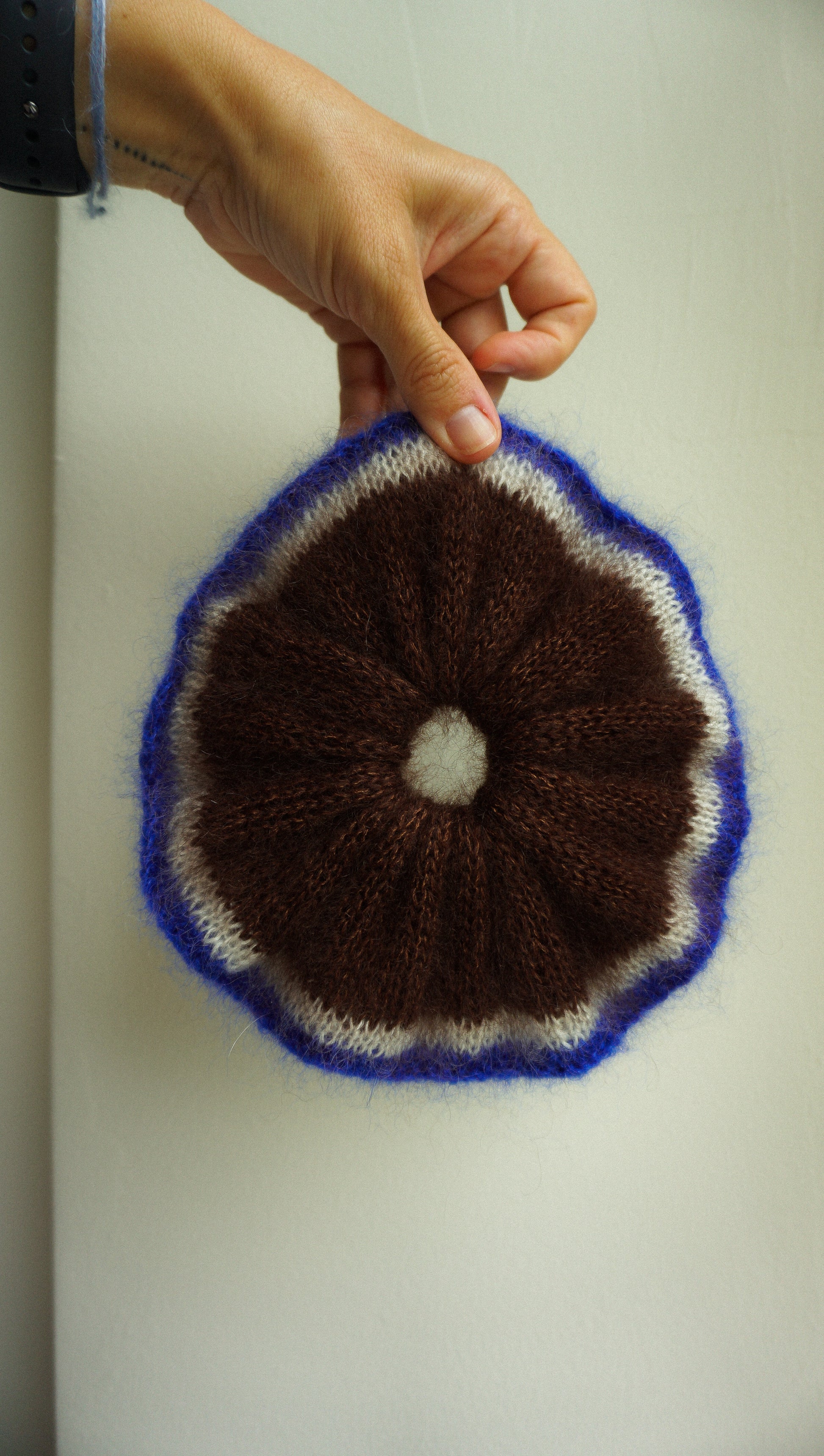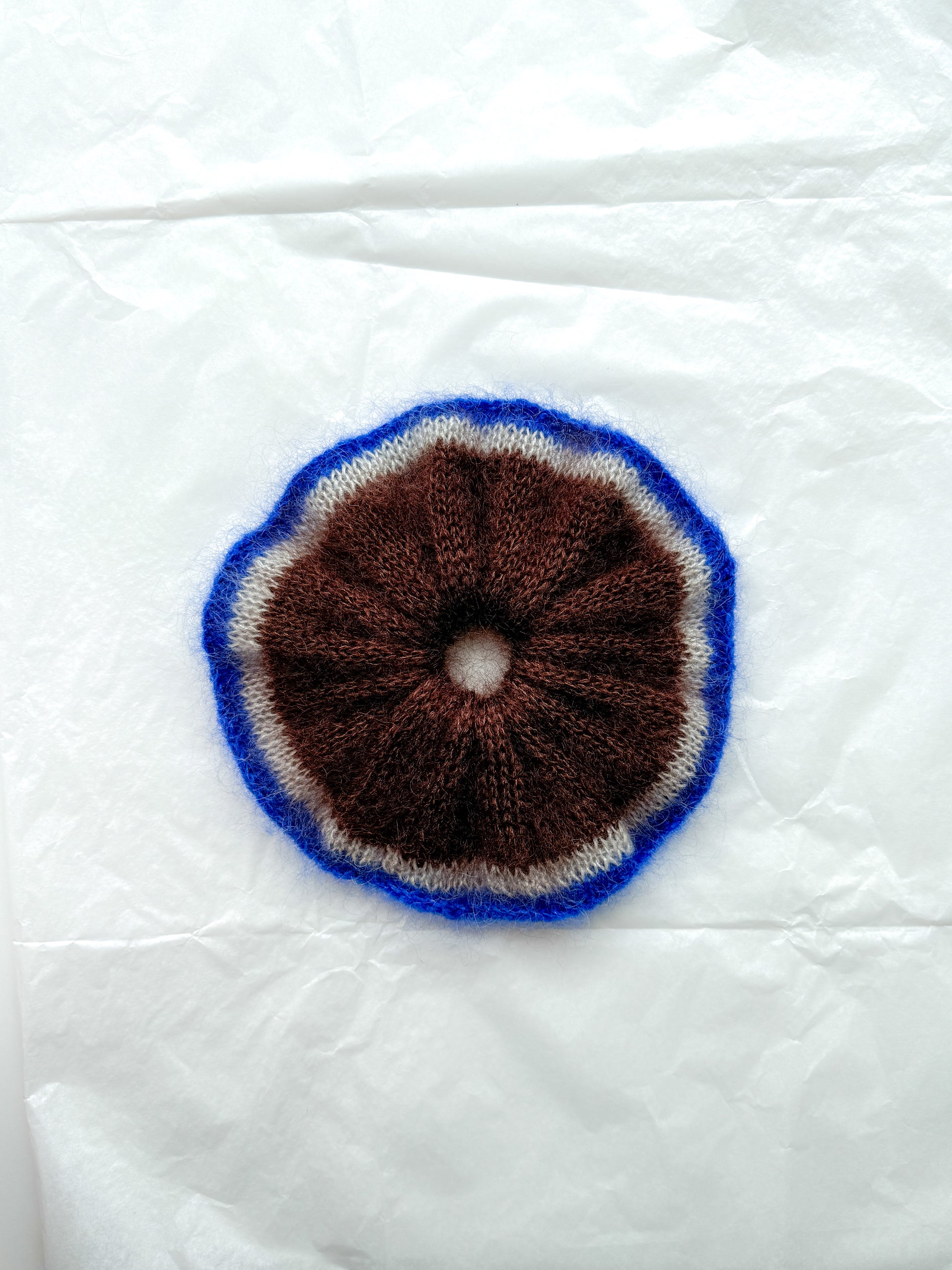 Brown knitted mohair scrunchie with bright blue trim