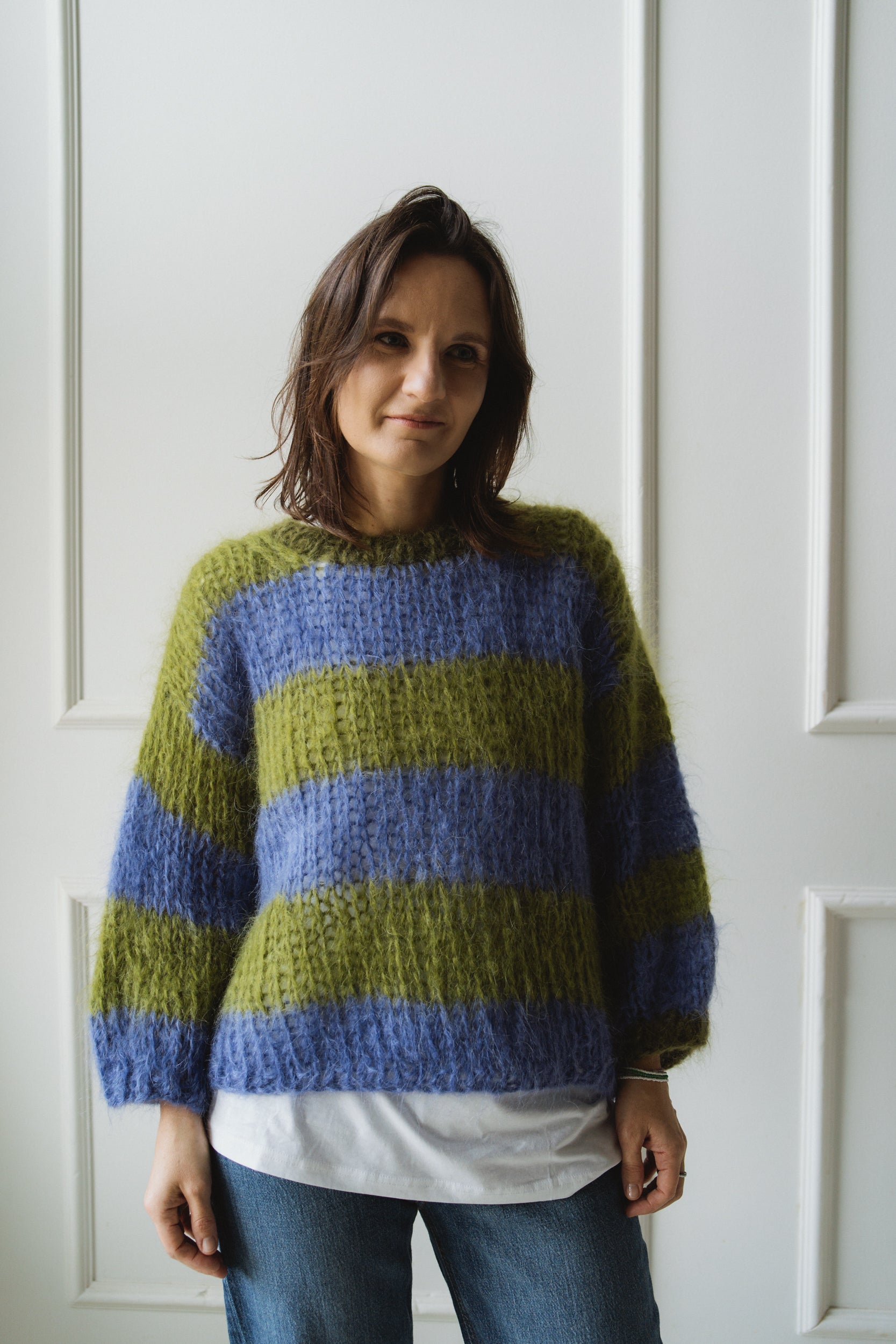 Stay cosy with this striped mohair sweater. The relaxed fit and fluffy texture bring comfort and ease, while the green and purple stripes add a stylish flair. Perfect for chilly days.