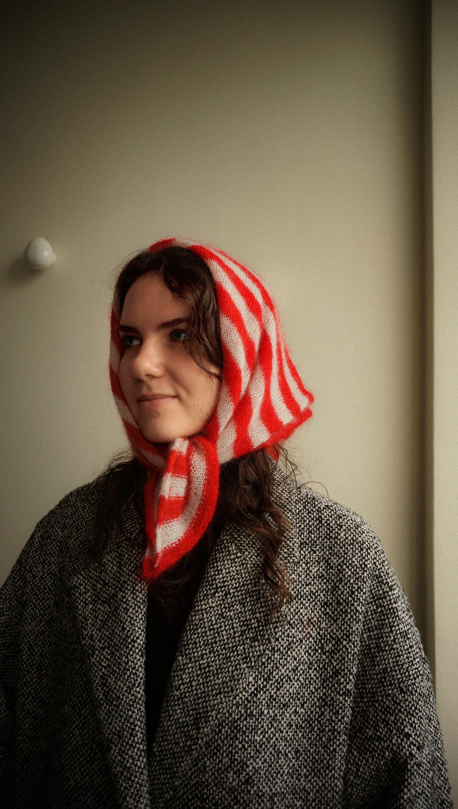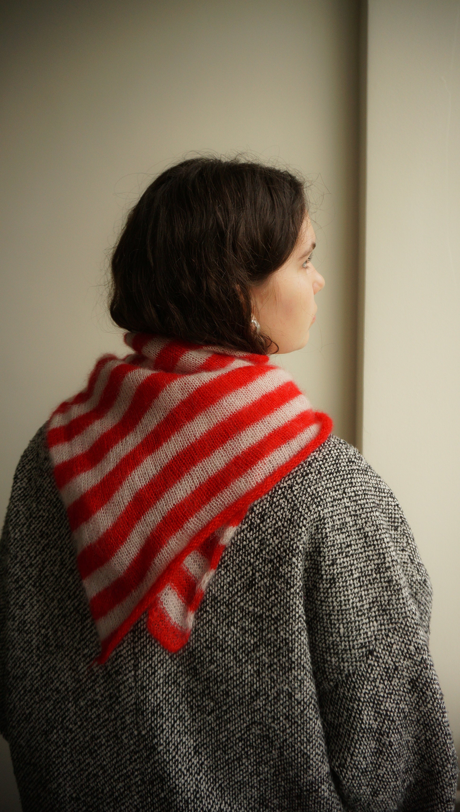 Head Scarf —your new go-to accessory for adding warmth and cheer to your day. Lovingly crafted from soft mohair in contrasting colour stripes.