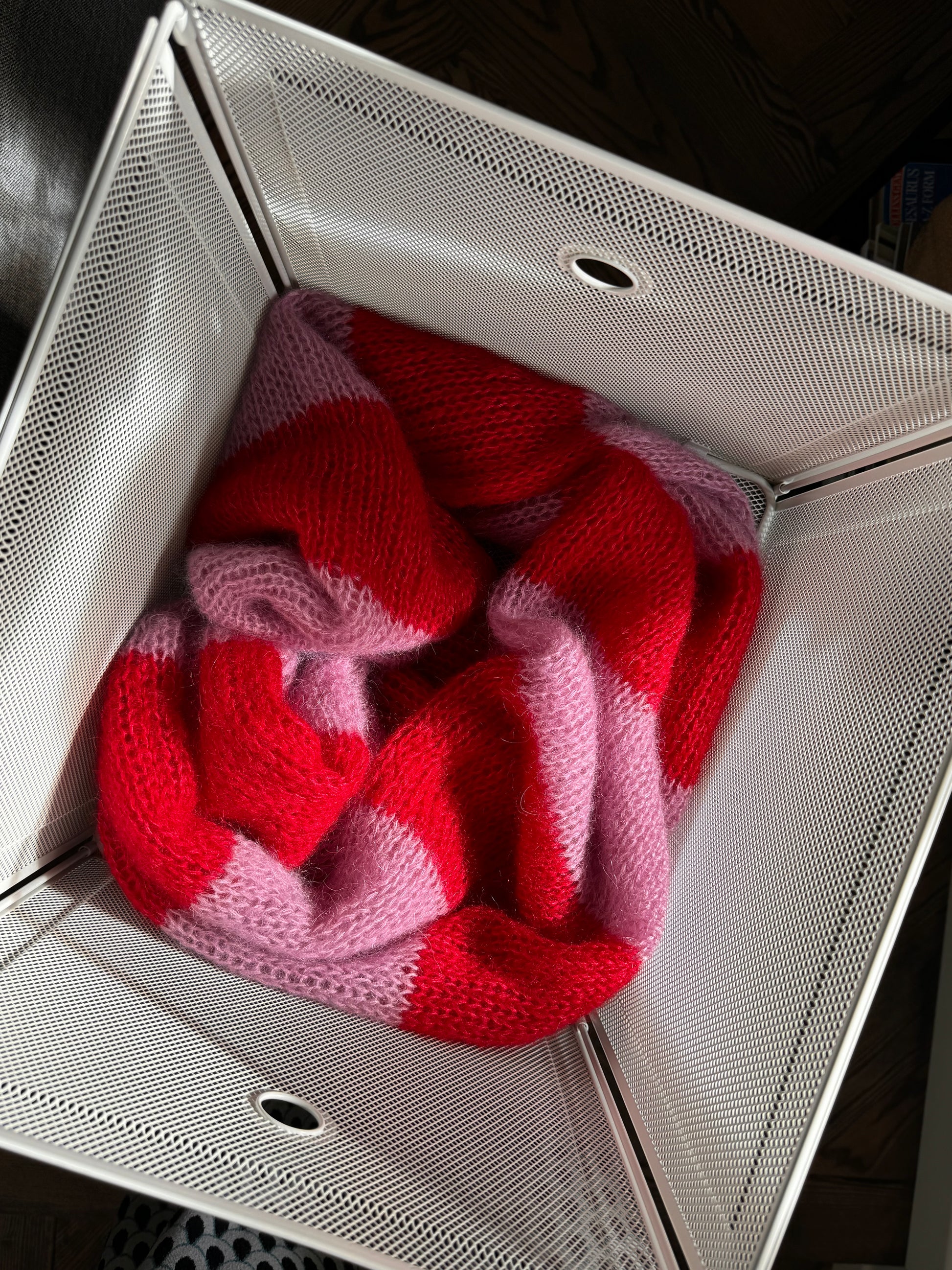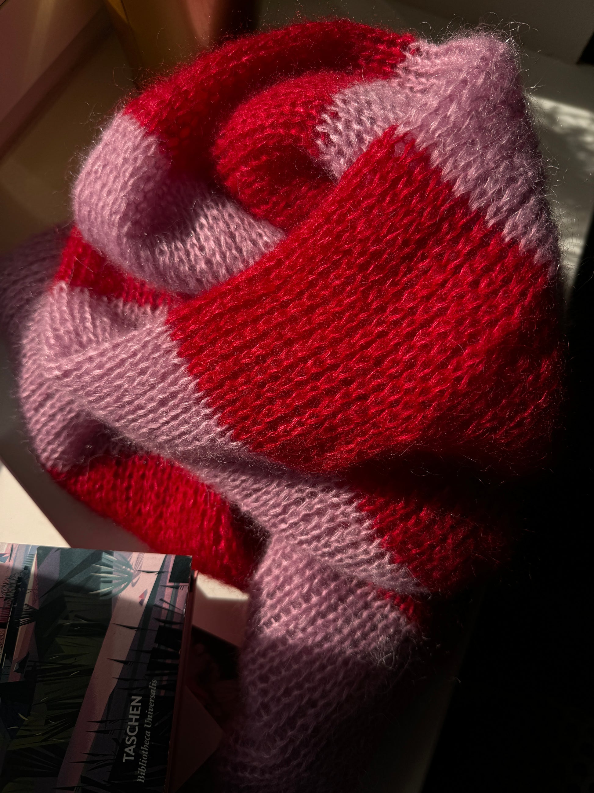 Hand knitted long and bulky scarf made from luxurious mohair silk blend (75% mohair, 25% silk) yarn in two colours: pink and red. It is double layered, very warm, soft and lightweight. Wrapping in it will give you a feeling of cosiness and relaxation.