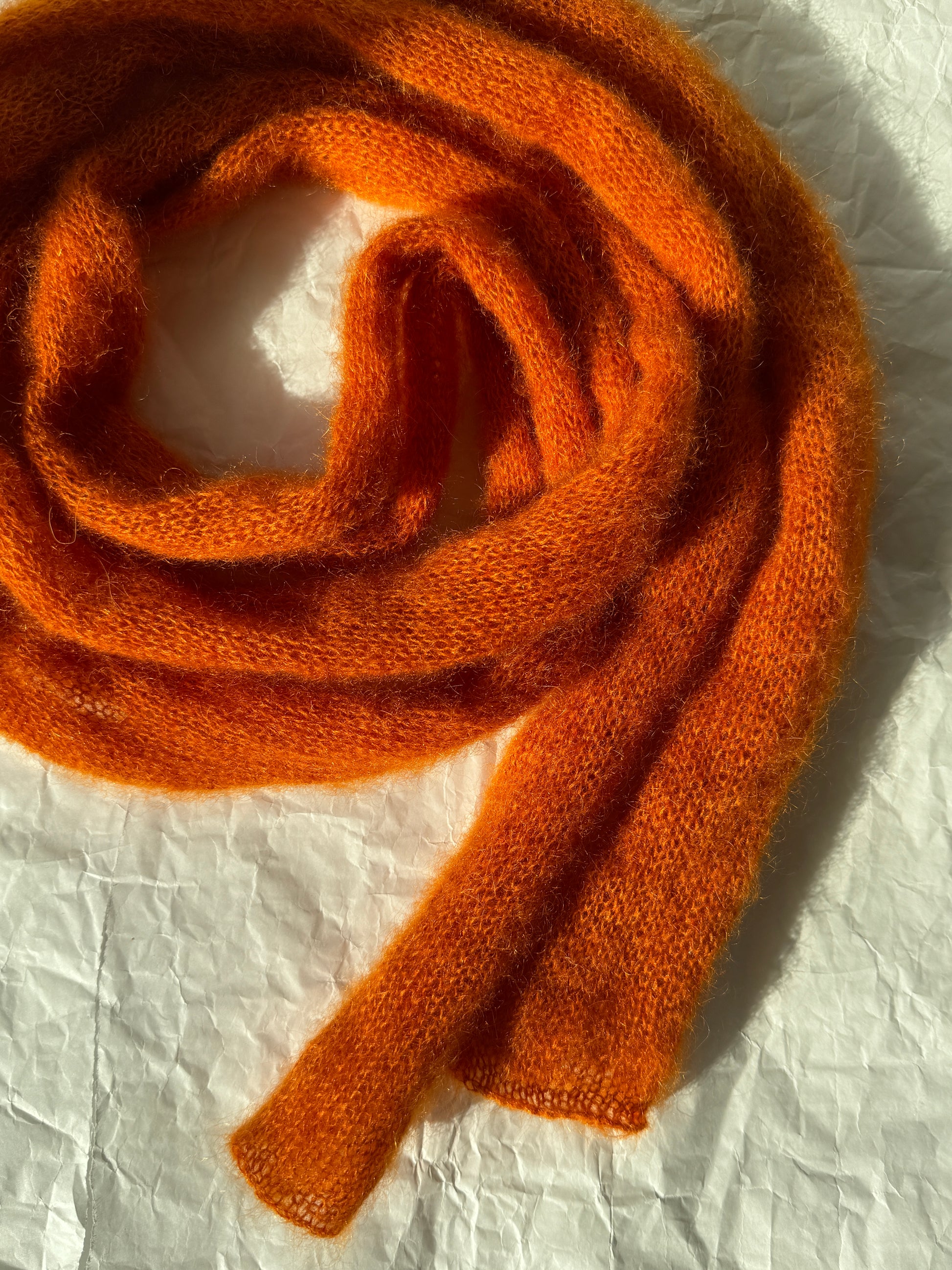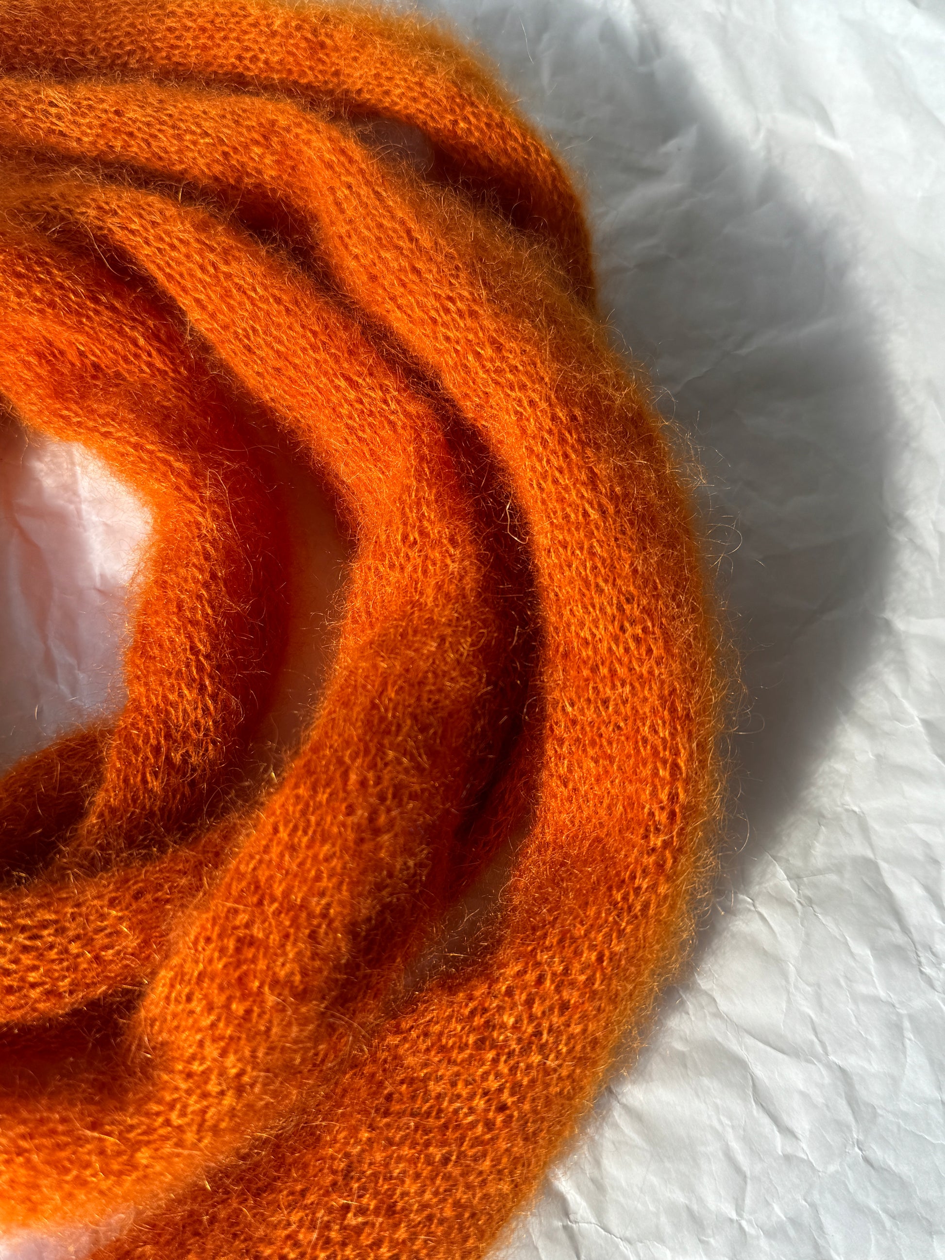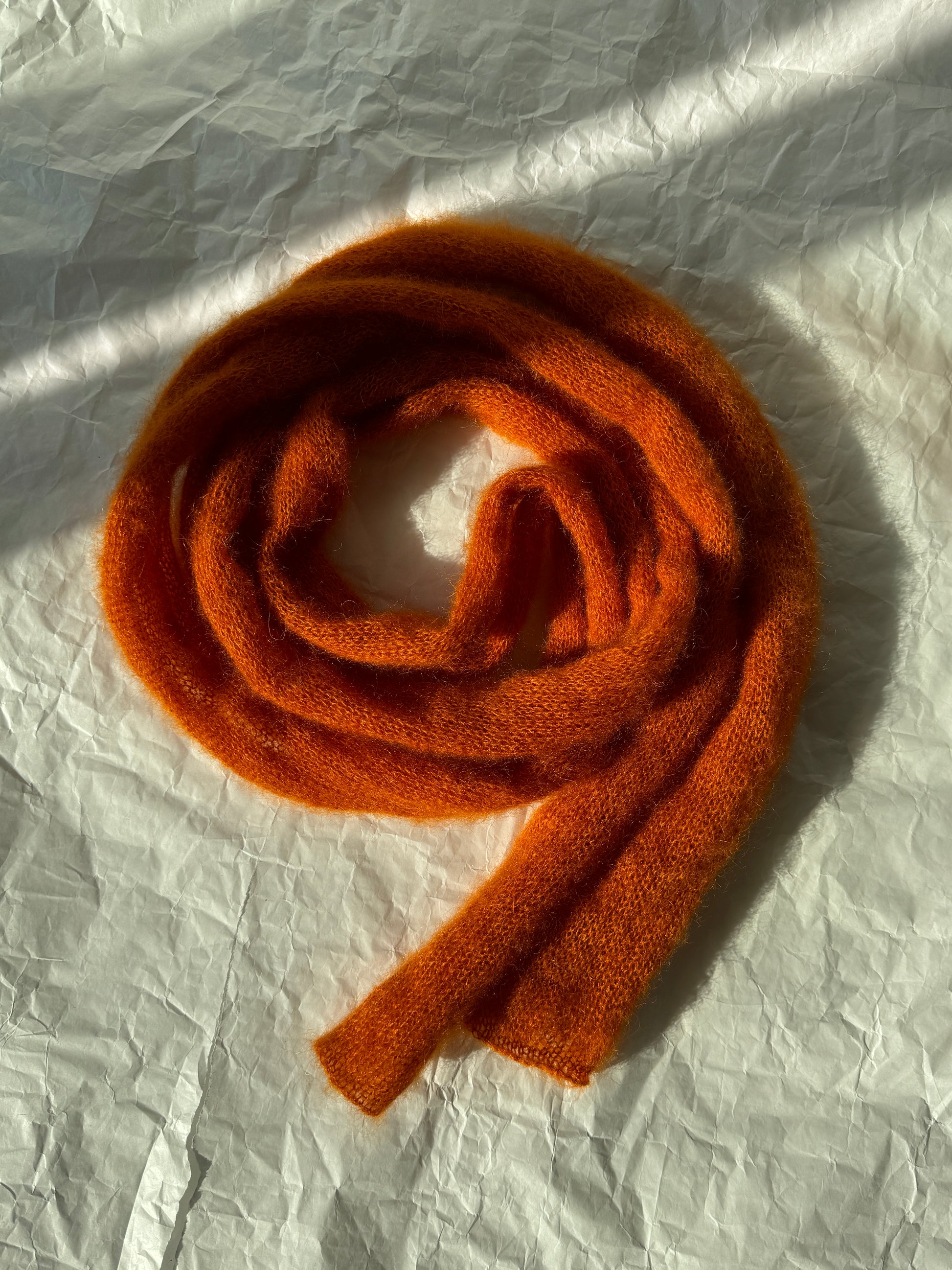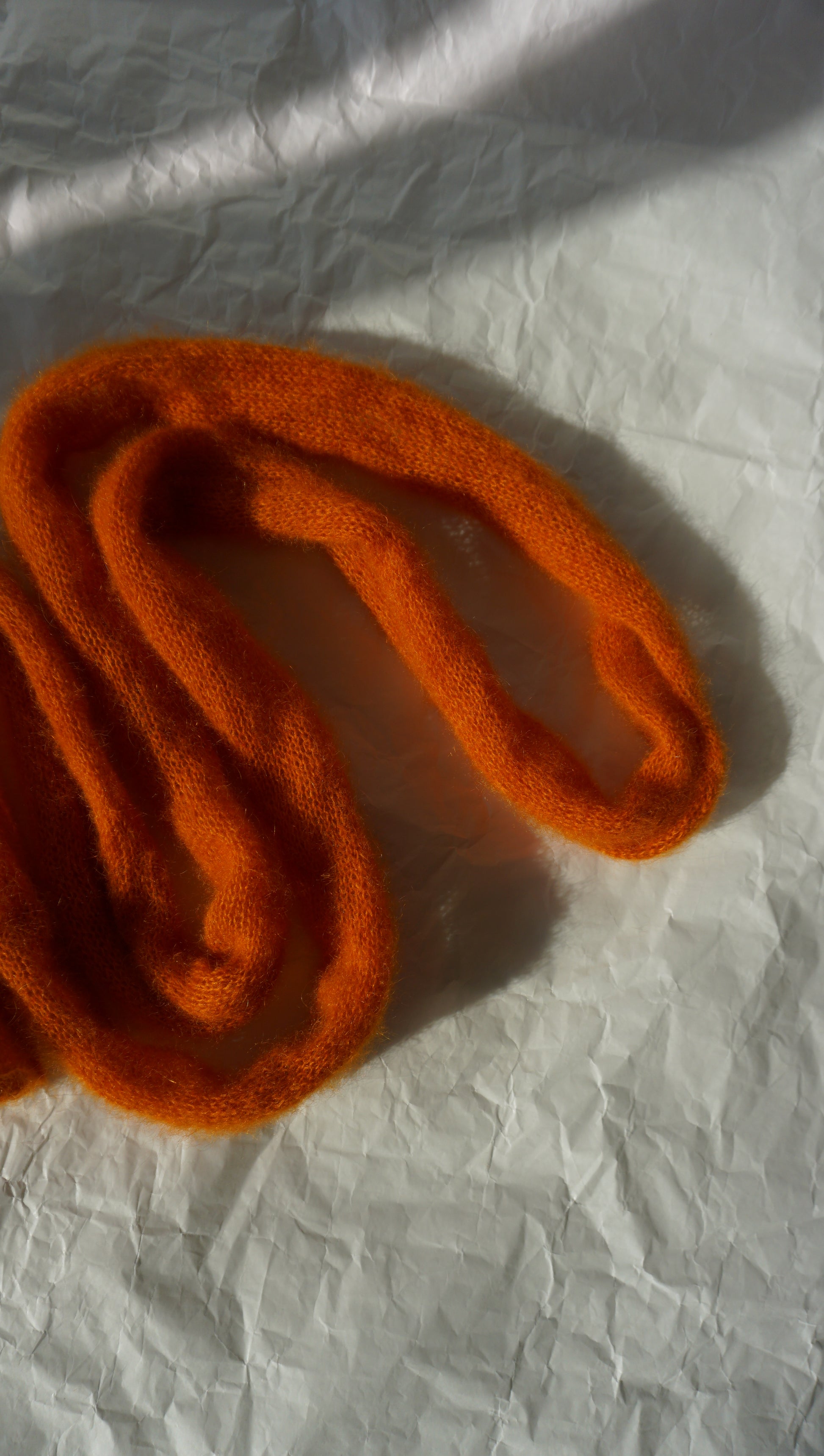 Hand knitted thin long skinny scarf made of luxurious mohair silk blend (75% mohair, 25% silk) yarn in burnt orange color.