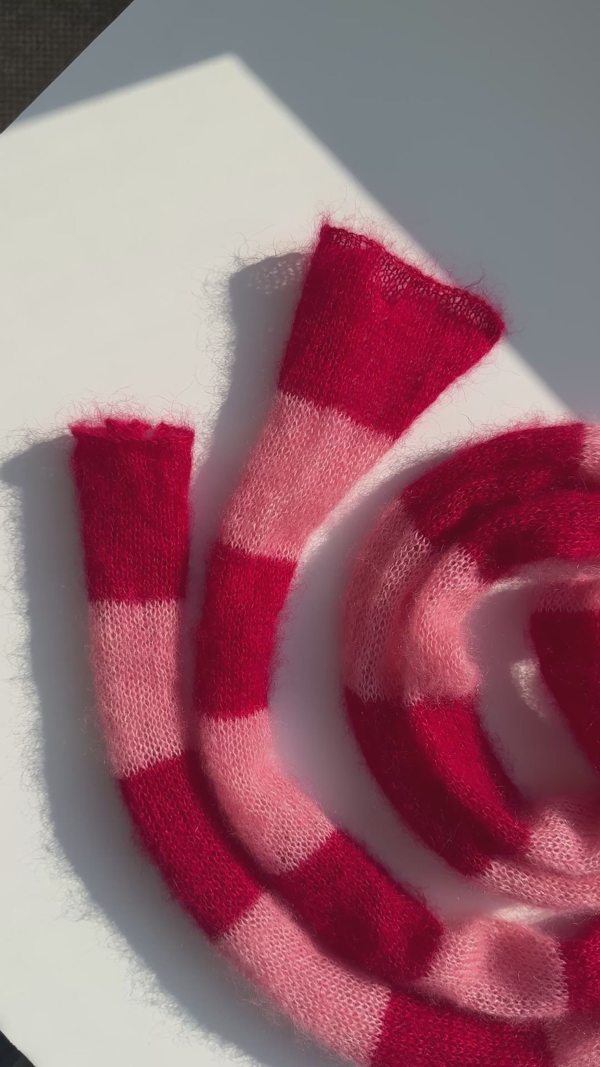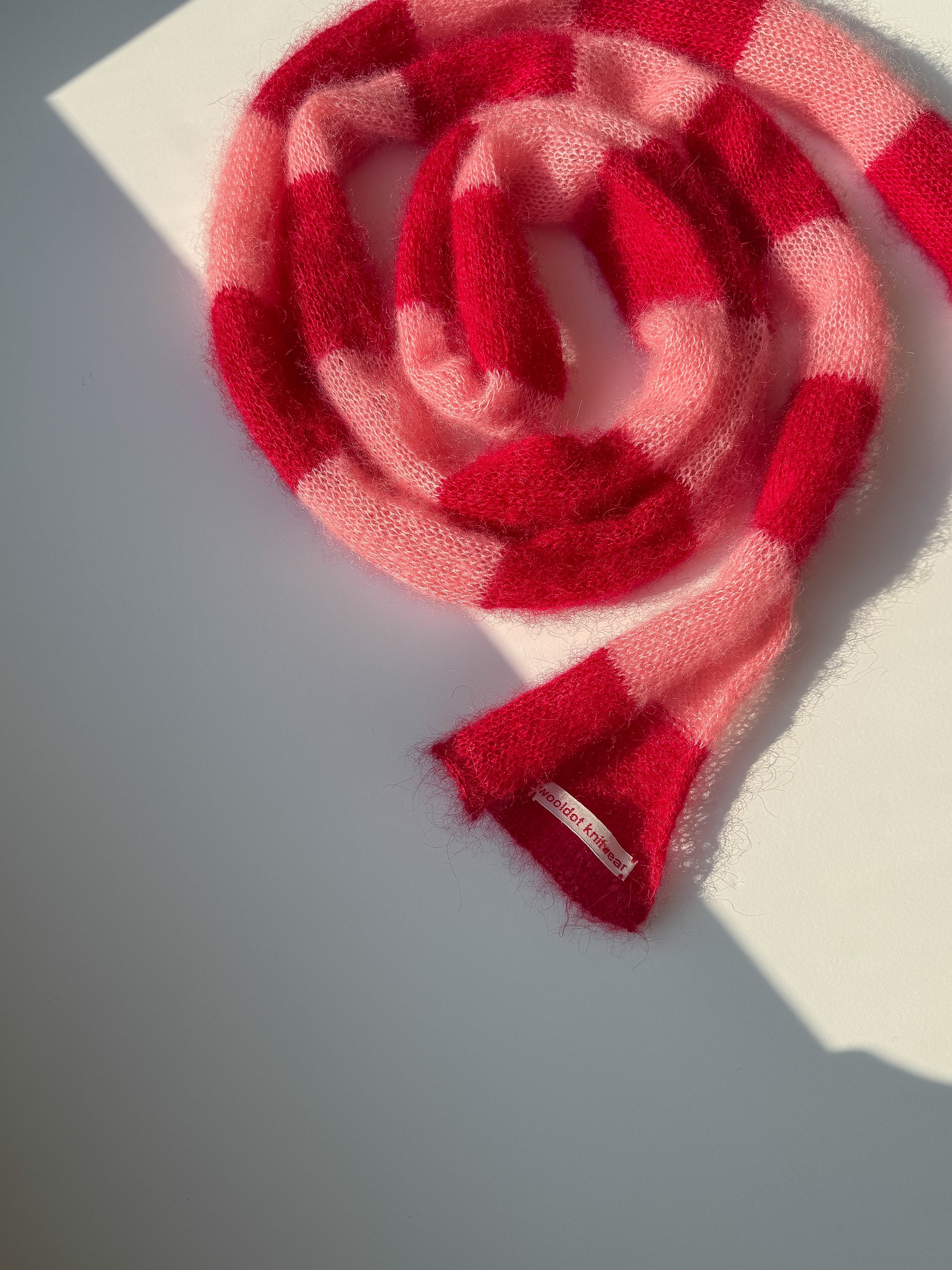 Hand knitted thin long skinny scarf made of luxurious mohair silk blend (75% mohair, 25% silk) yarn in red and pink stripes.