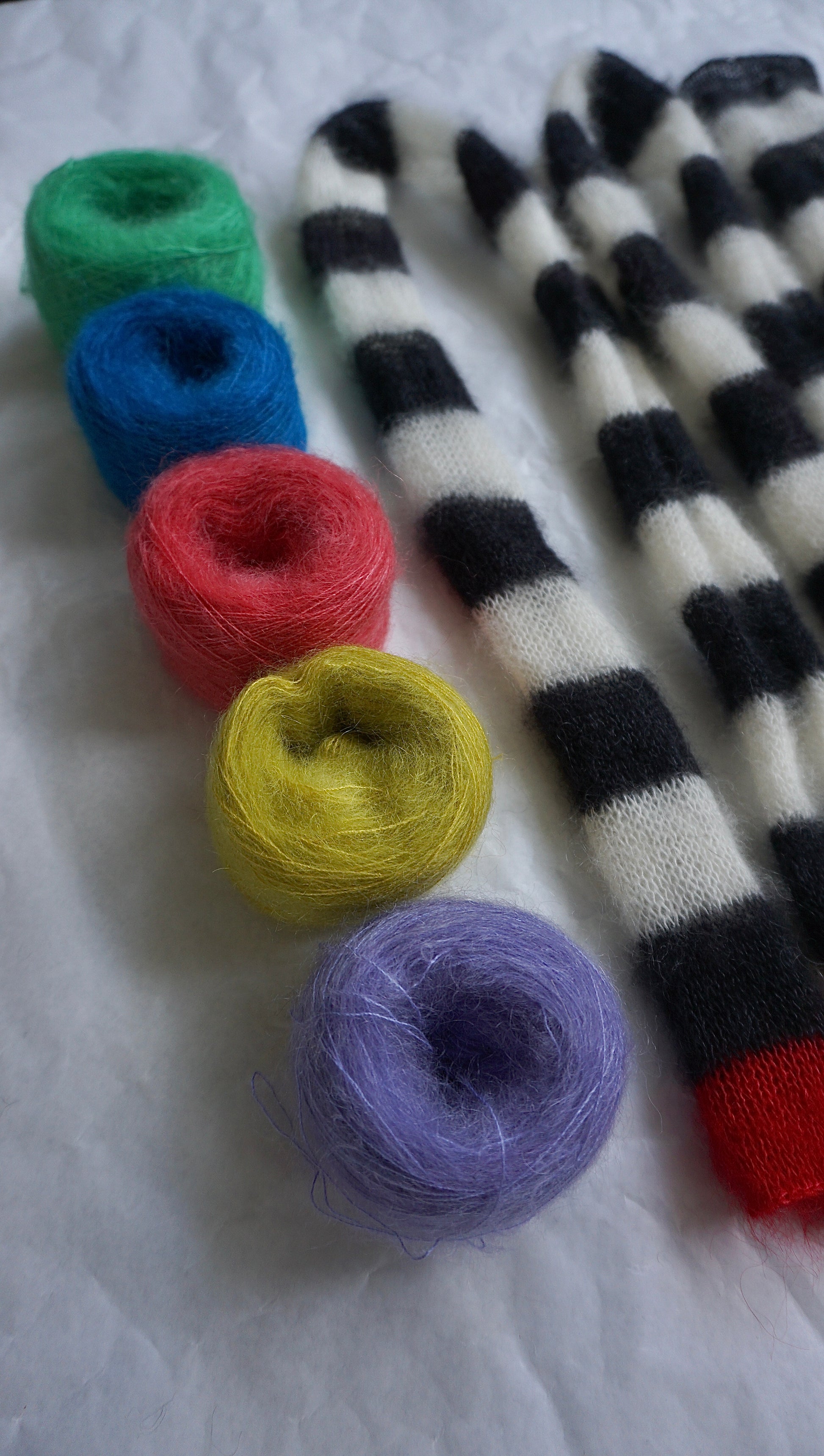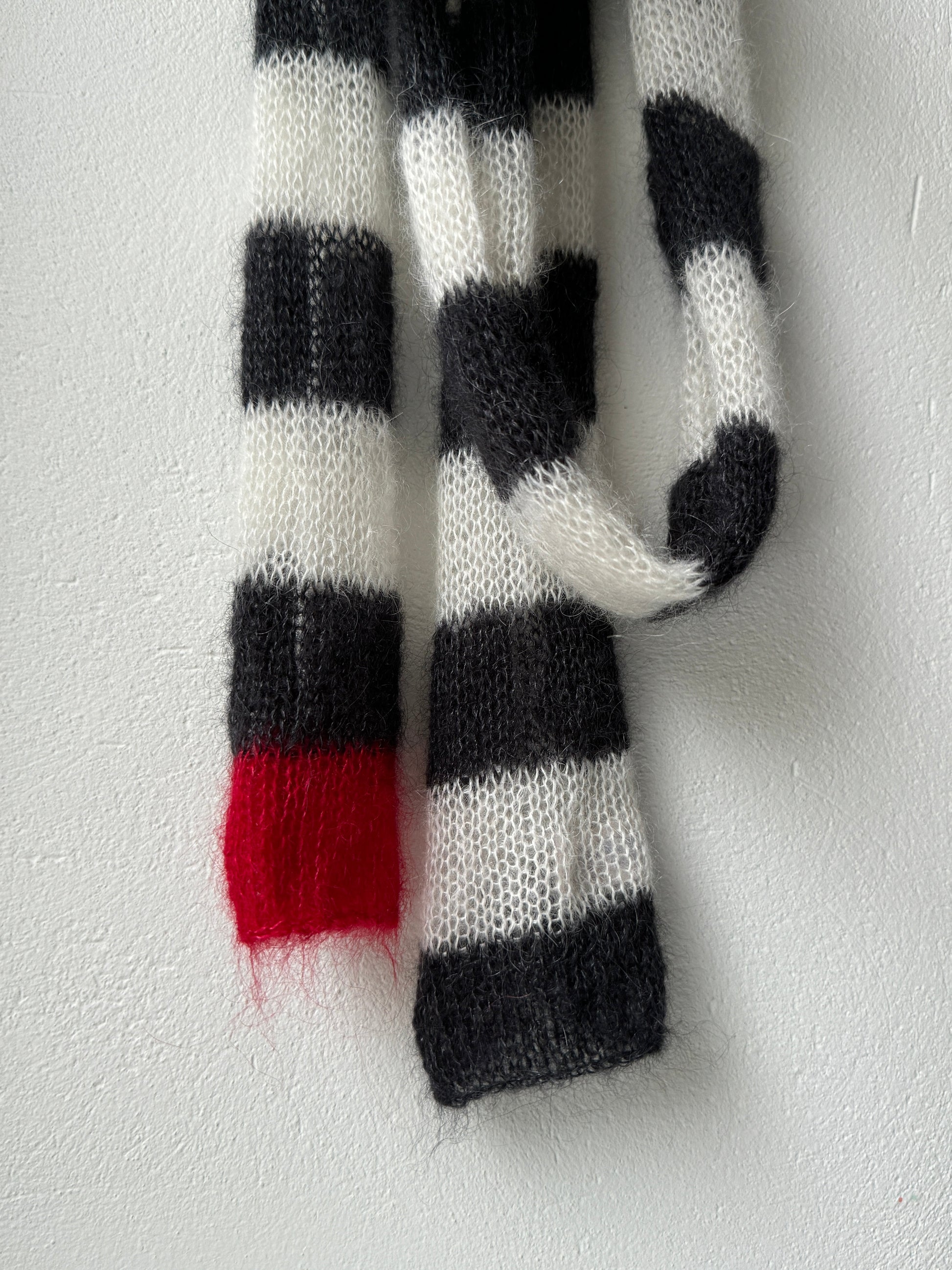 Hand knitted thin long skinny scarf made of luxurious mohair silk blend (75% mohair, 25% silk) yarn in black and white stripes with a small colorful detail at one end.