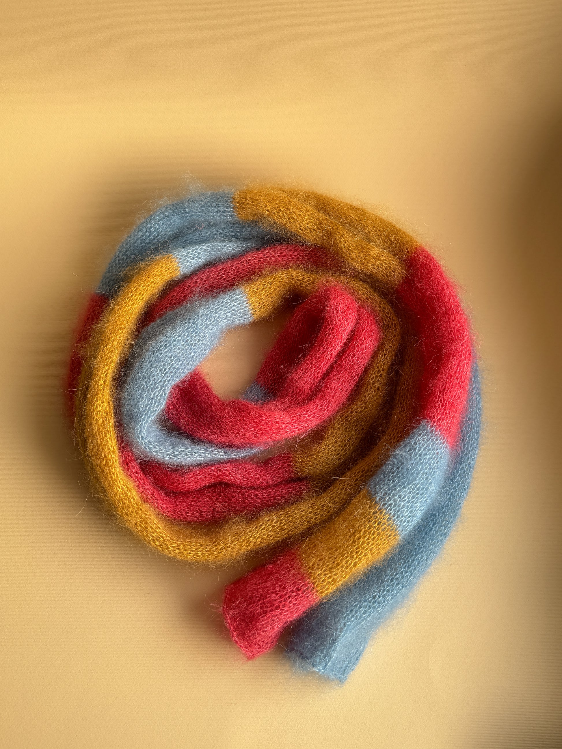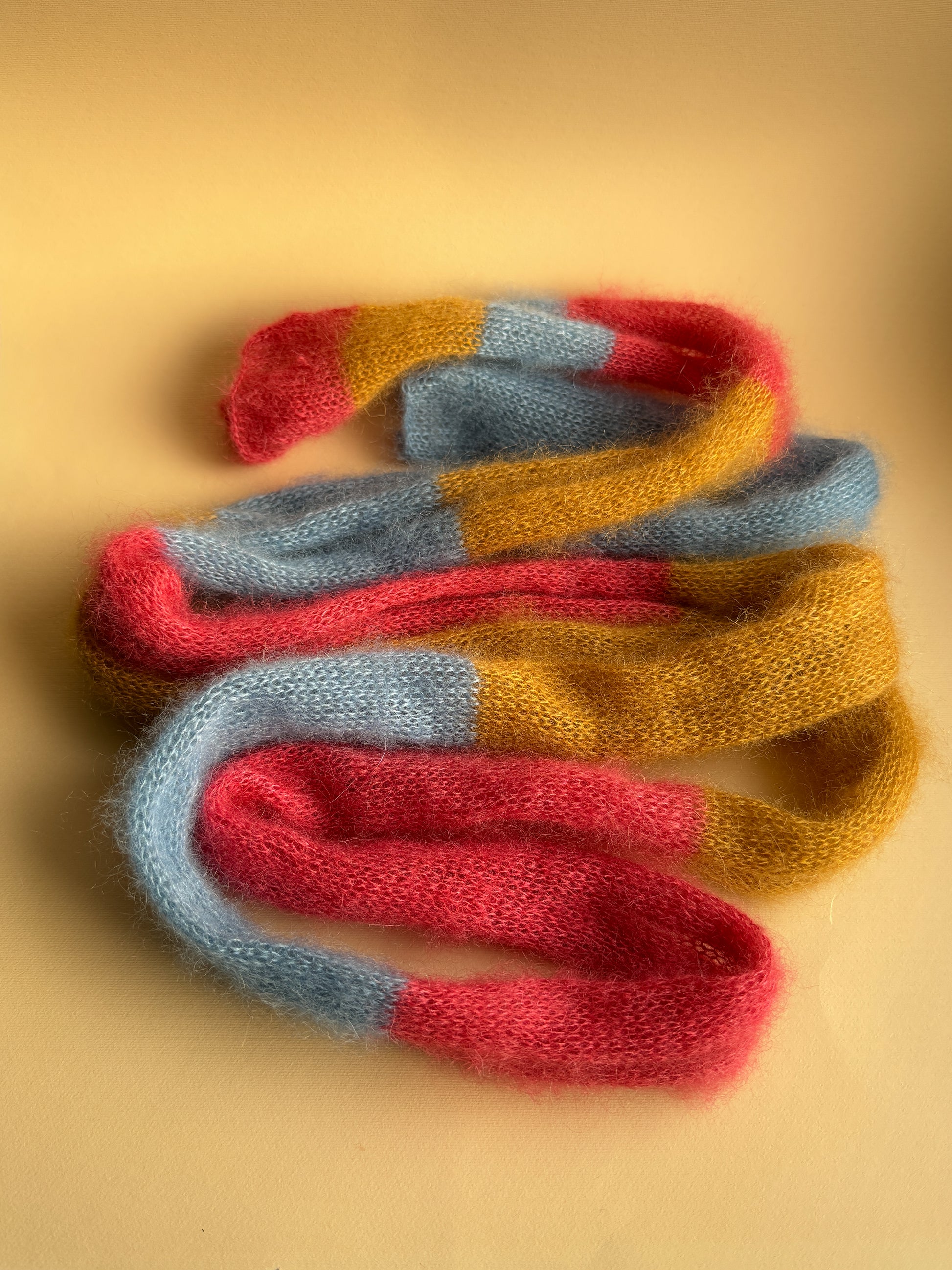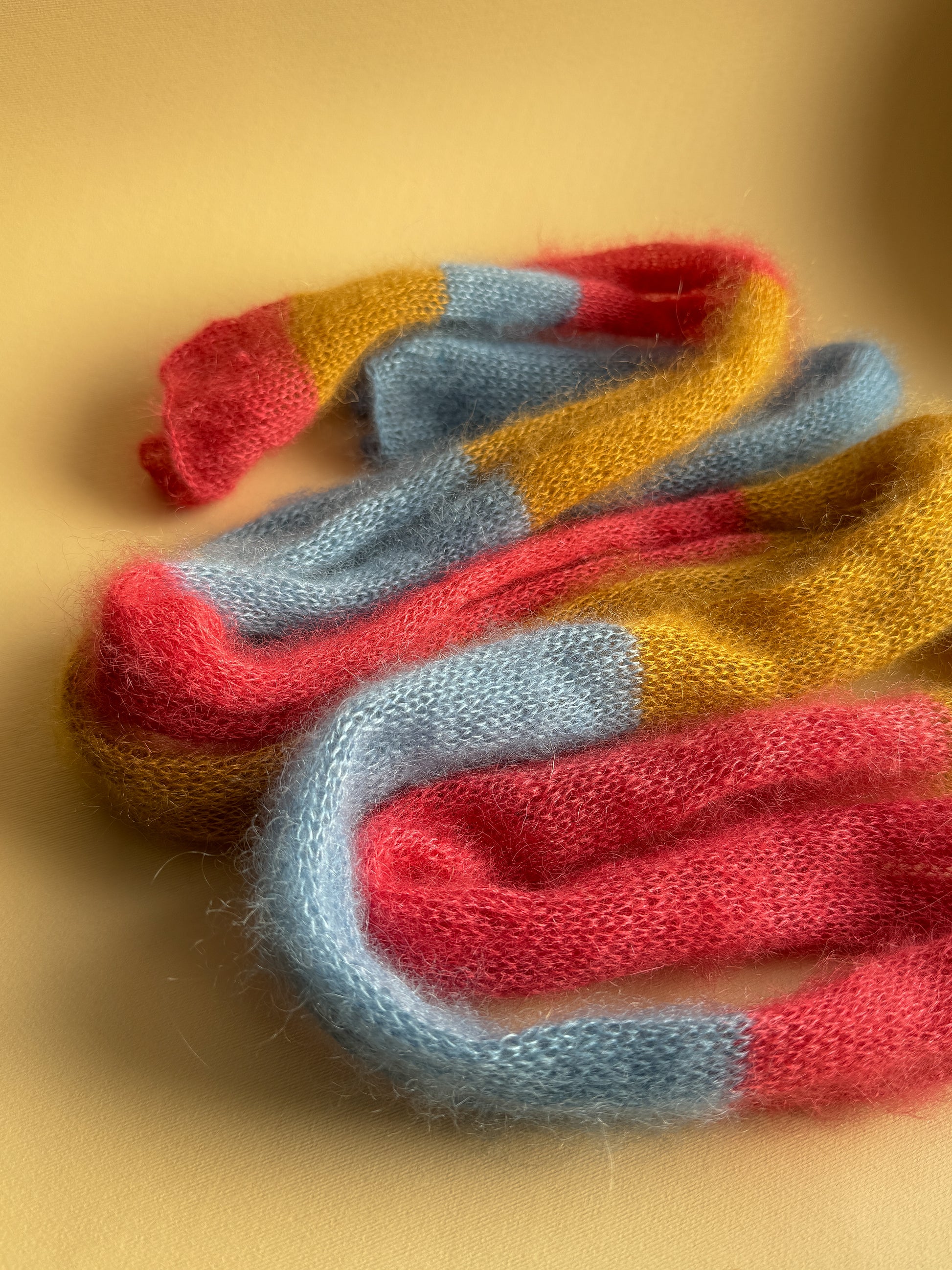 Hand knitted thin long skinny scarf made of luxurious mohair silk blend (75% mohair, 25% silk) yarn in pink blue and dark yellow stripes.