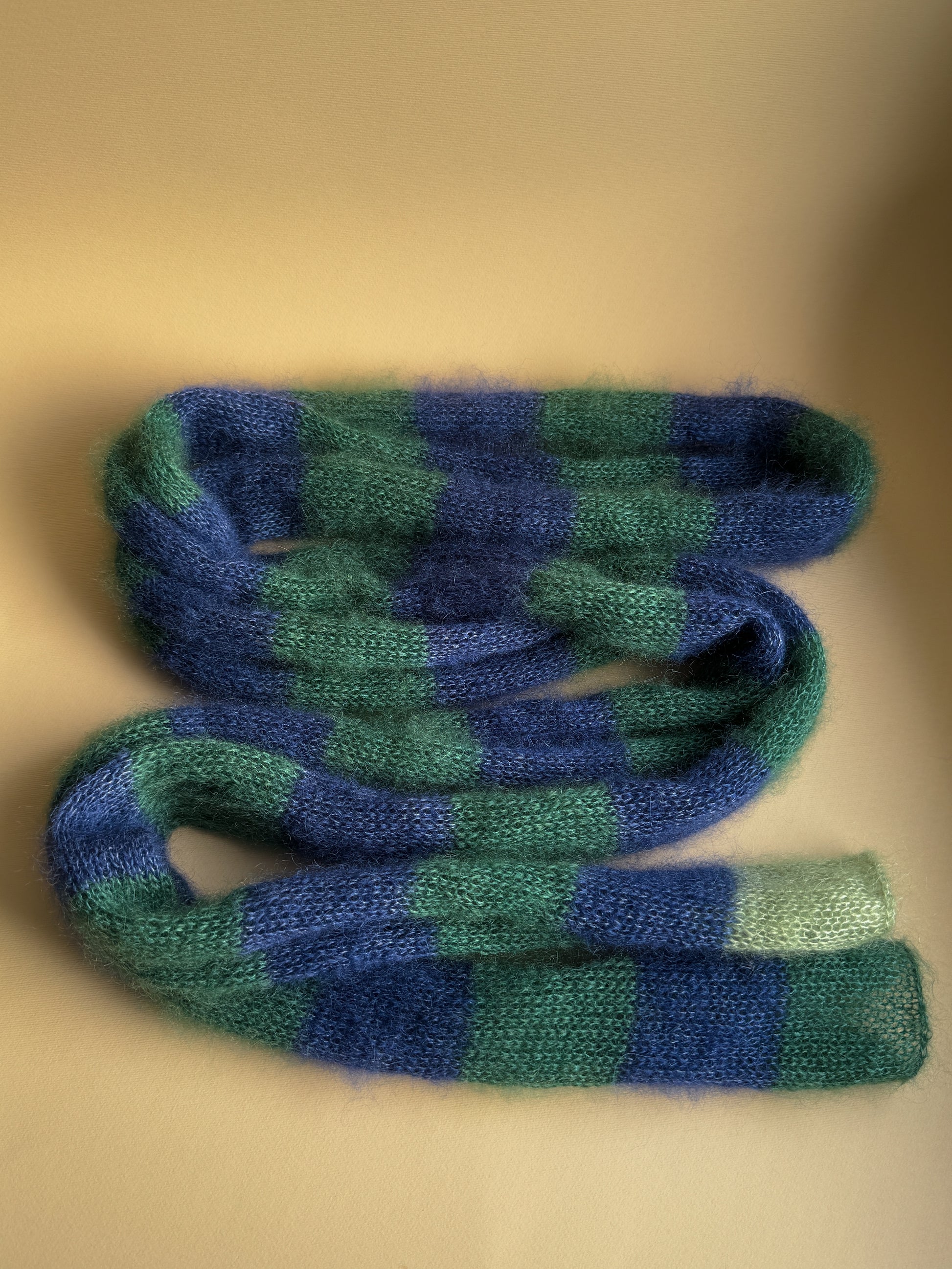 Hand knitted thin long skinny scarf made of luxurious mohair silk blend (75% mohair, 25% silk) yarn in dark blue and dark green stripes with a little light green detail at one end.