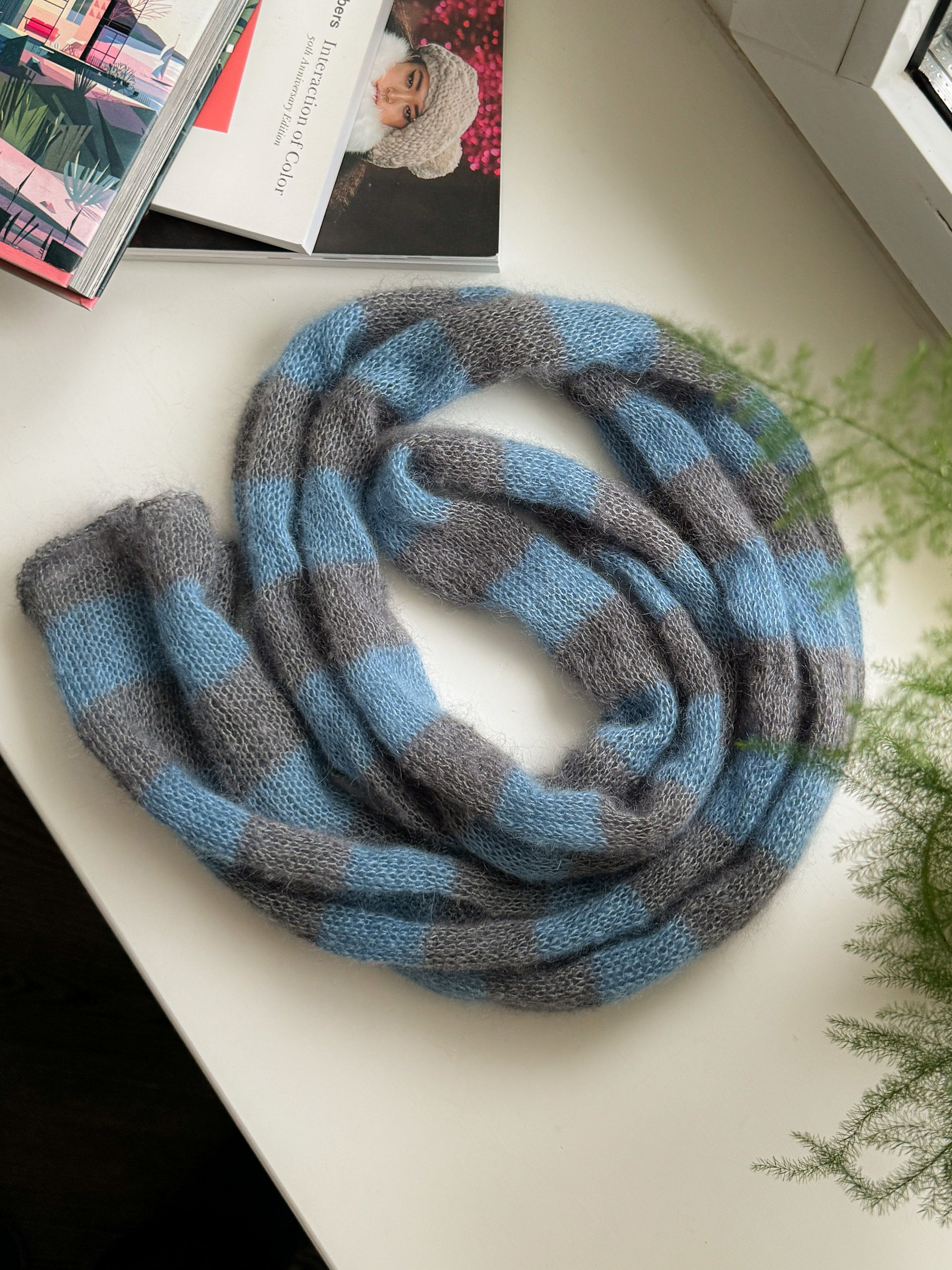 Hand knitted thin long skinny scarf made of luxurious mohair silk blend (75% mohair, 25% silk) yarn in grey and light blue stripes.