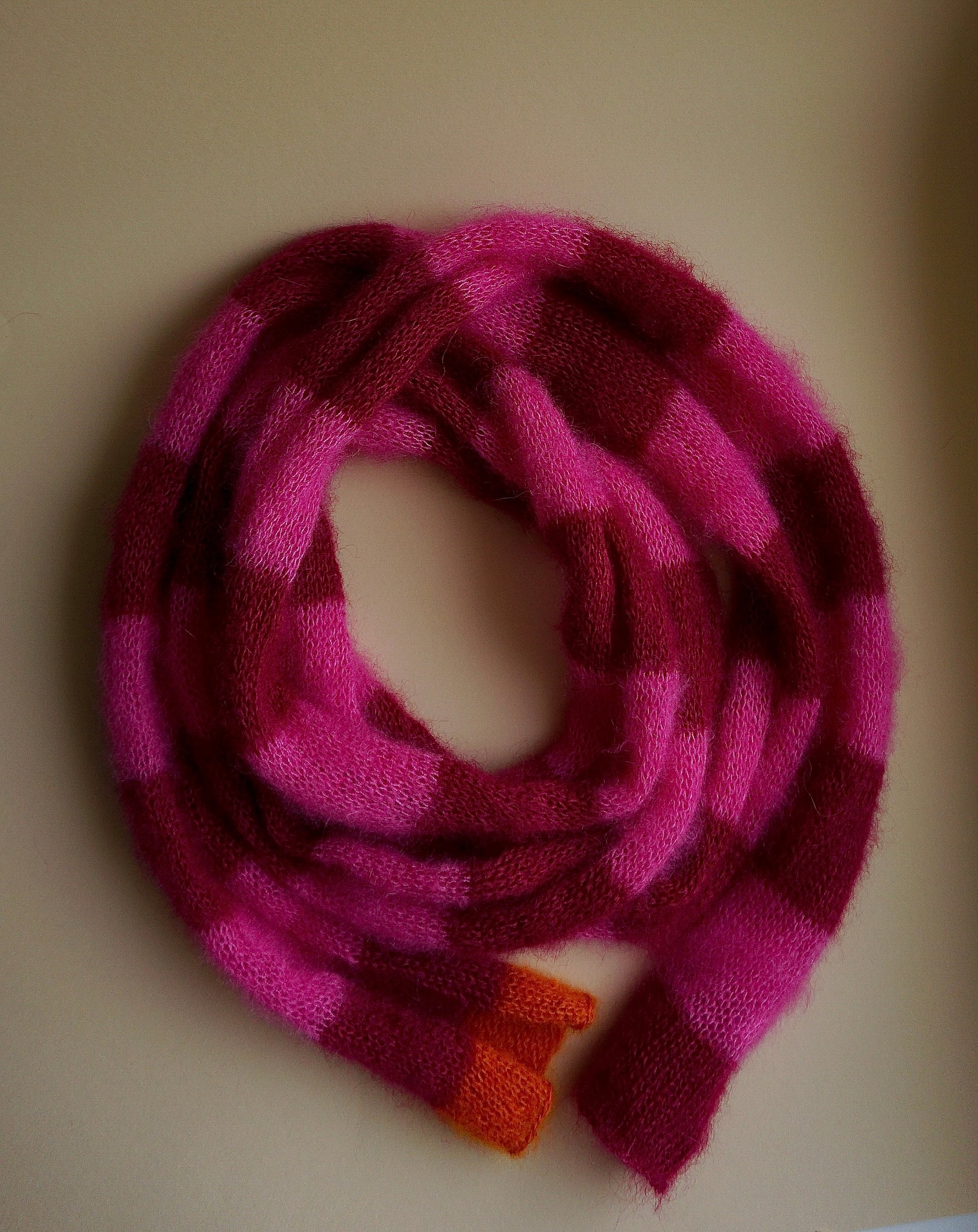 Hand knitted thin long skinny scarf made of luxurious mohair silk blend (75% mohair, 25% silk) yarn in bordo and bright pink color with little orange detail at one end.