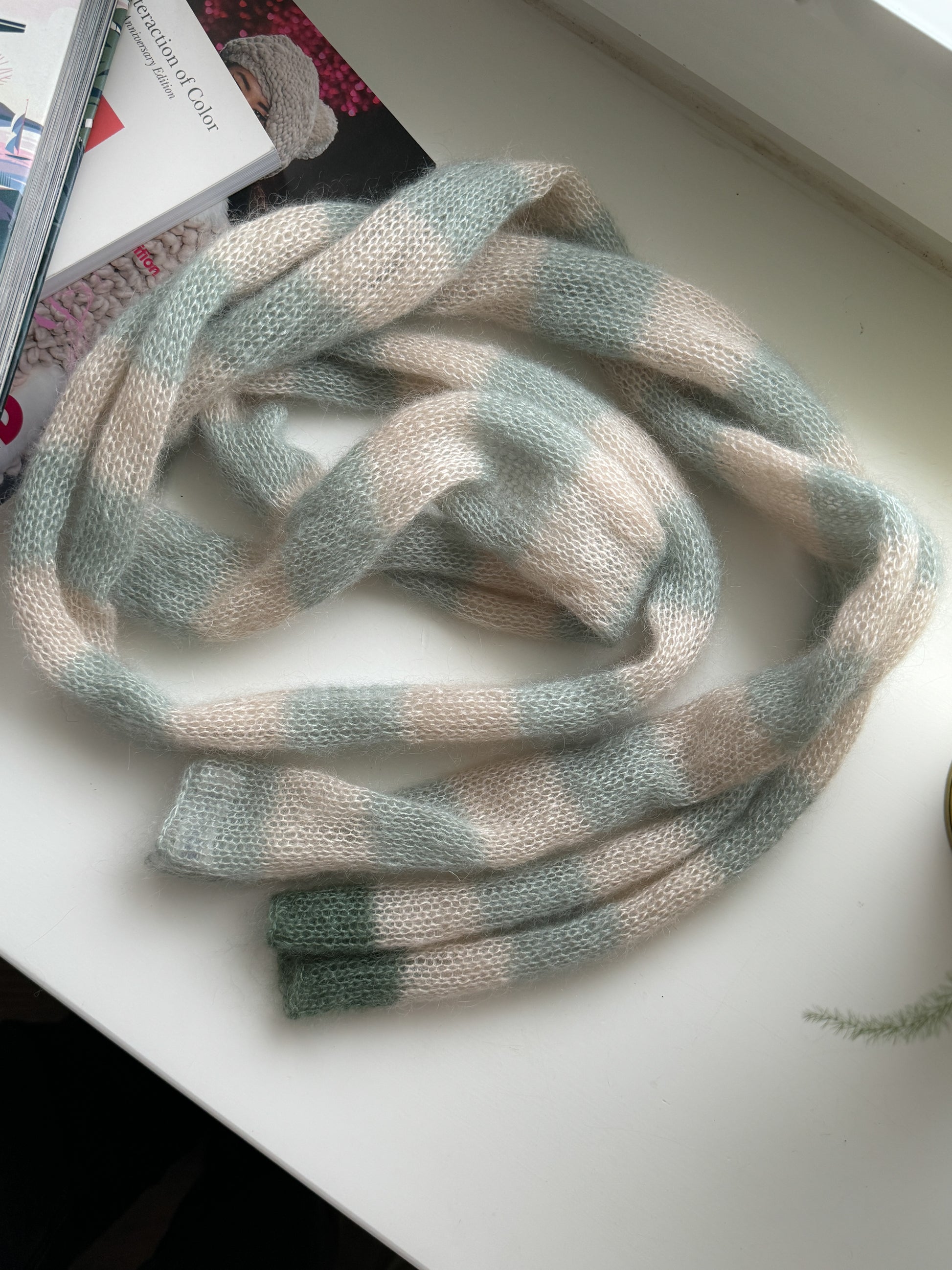 Hand knitted thin long skinny scarf made of luxurious mohair silk blend (75% mohair, 25% silk) yarn in sand and light green (sage) stripes with a darker green at one end of the scarf.