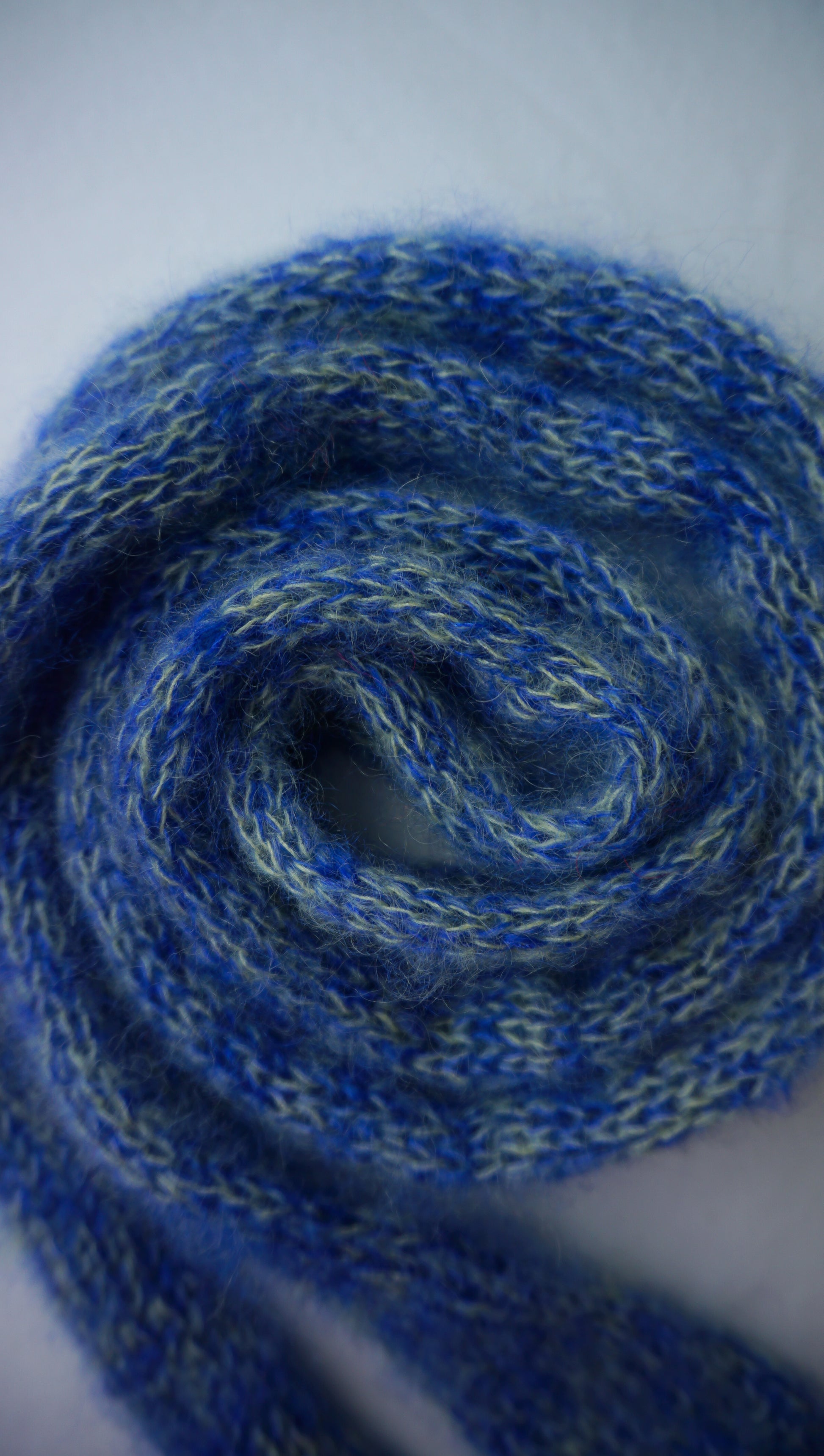 This hand-knitted, soft, small scarf is crafted from a luxurious mohair–silk blend yarn (75% mohair, 25% silk). It features a beautiful melange of cobalt blue and light blue tones.