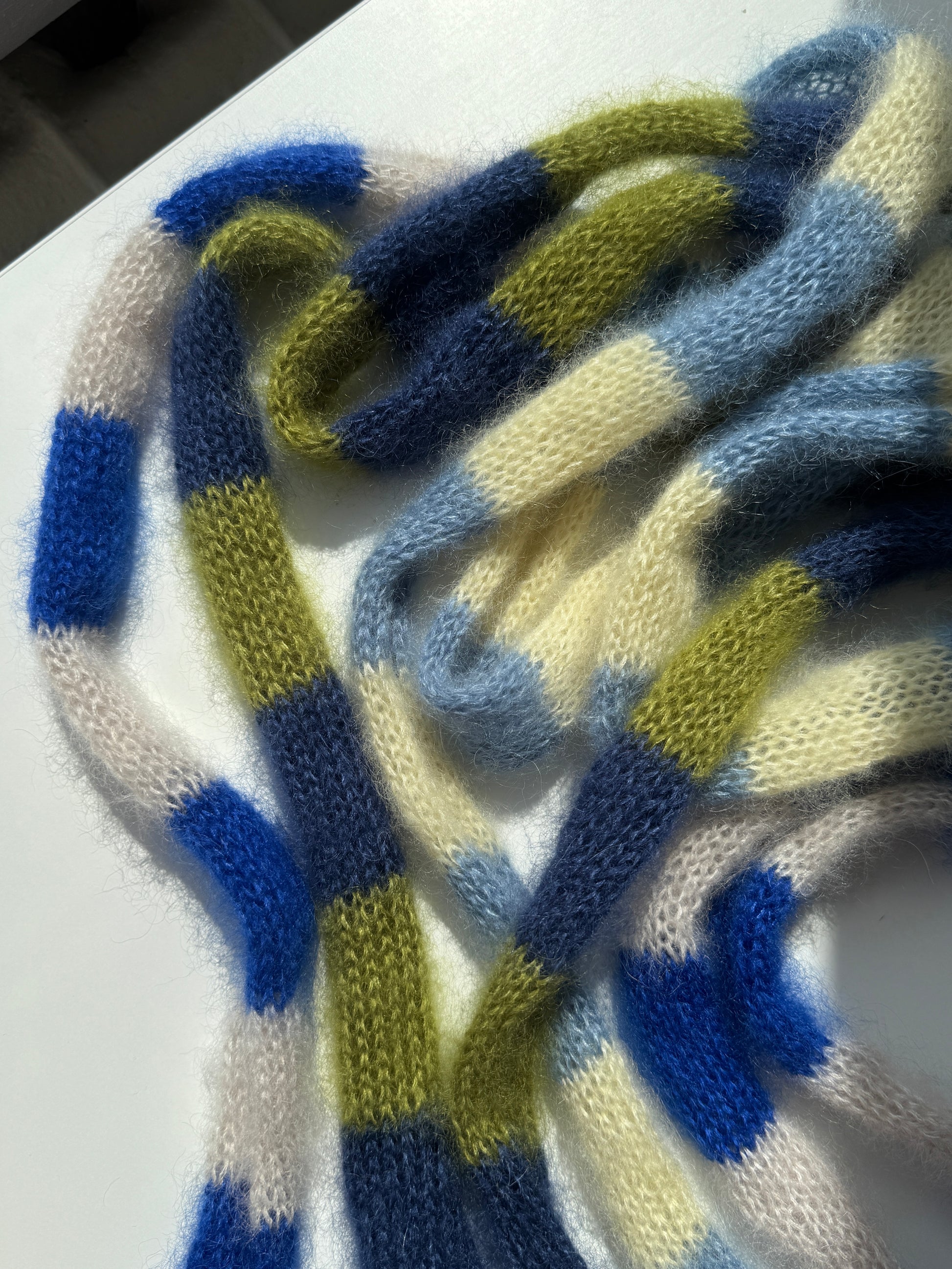 Small skinny mohair scarf dark blue and green stripes