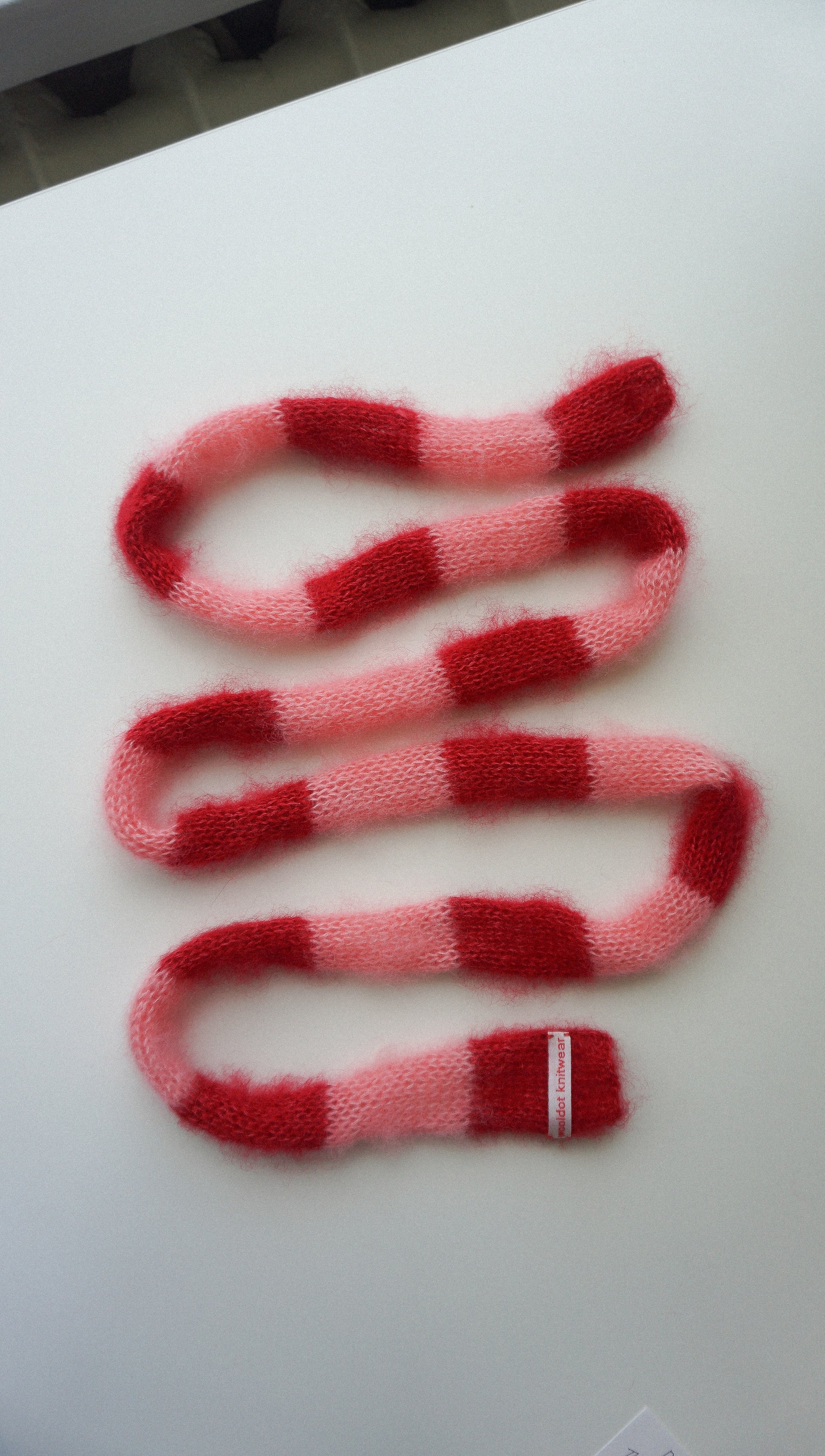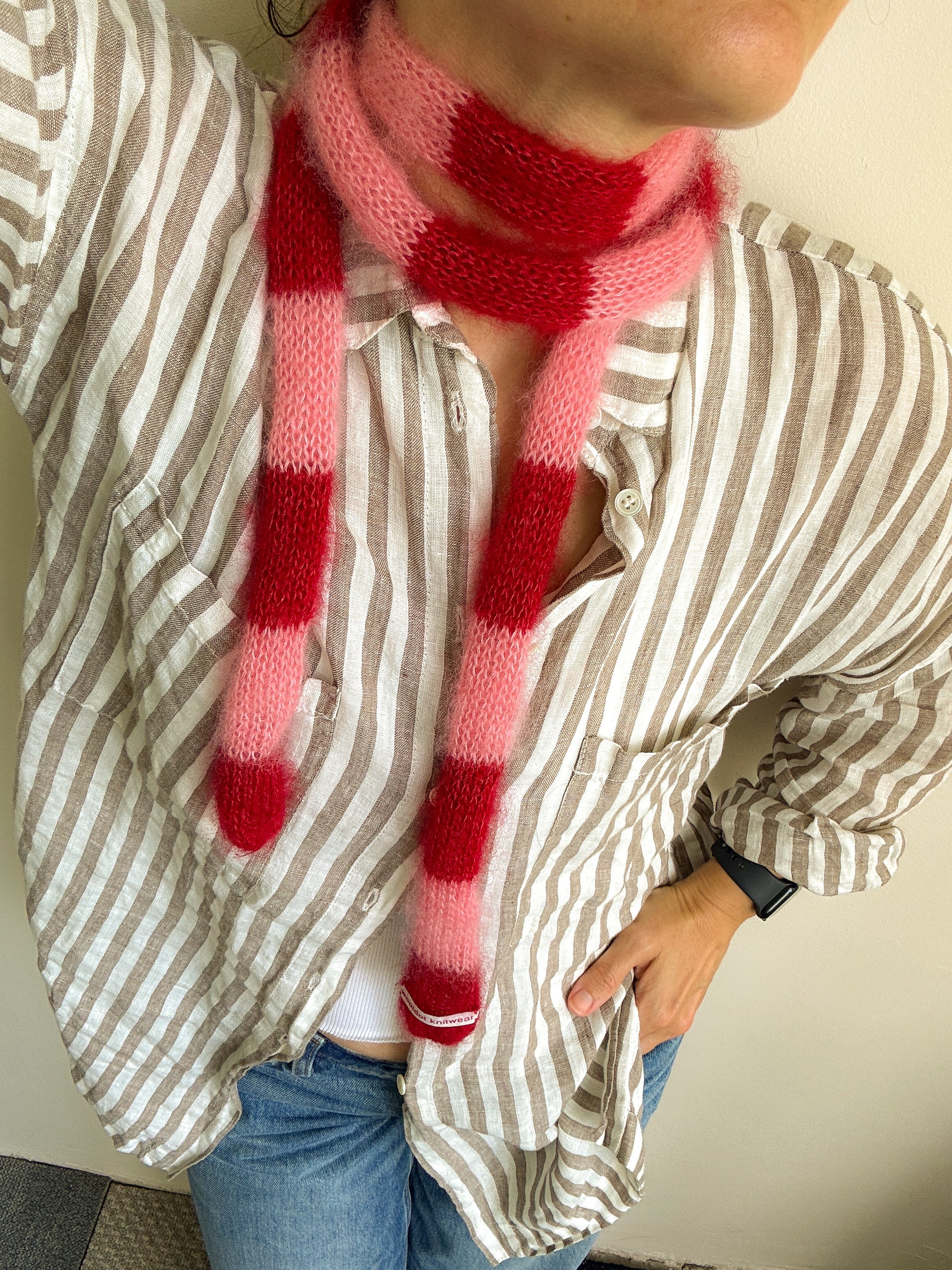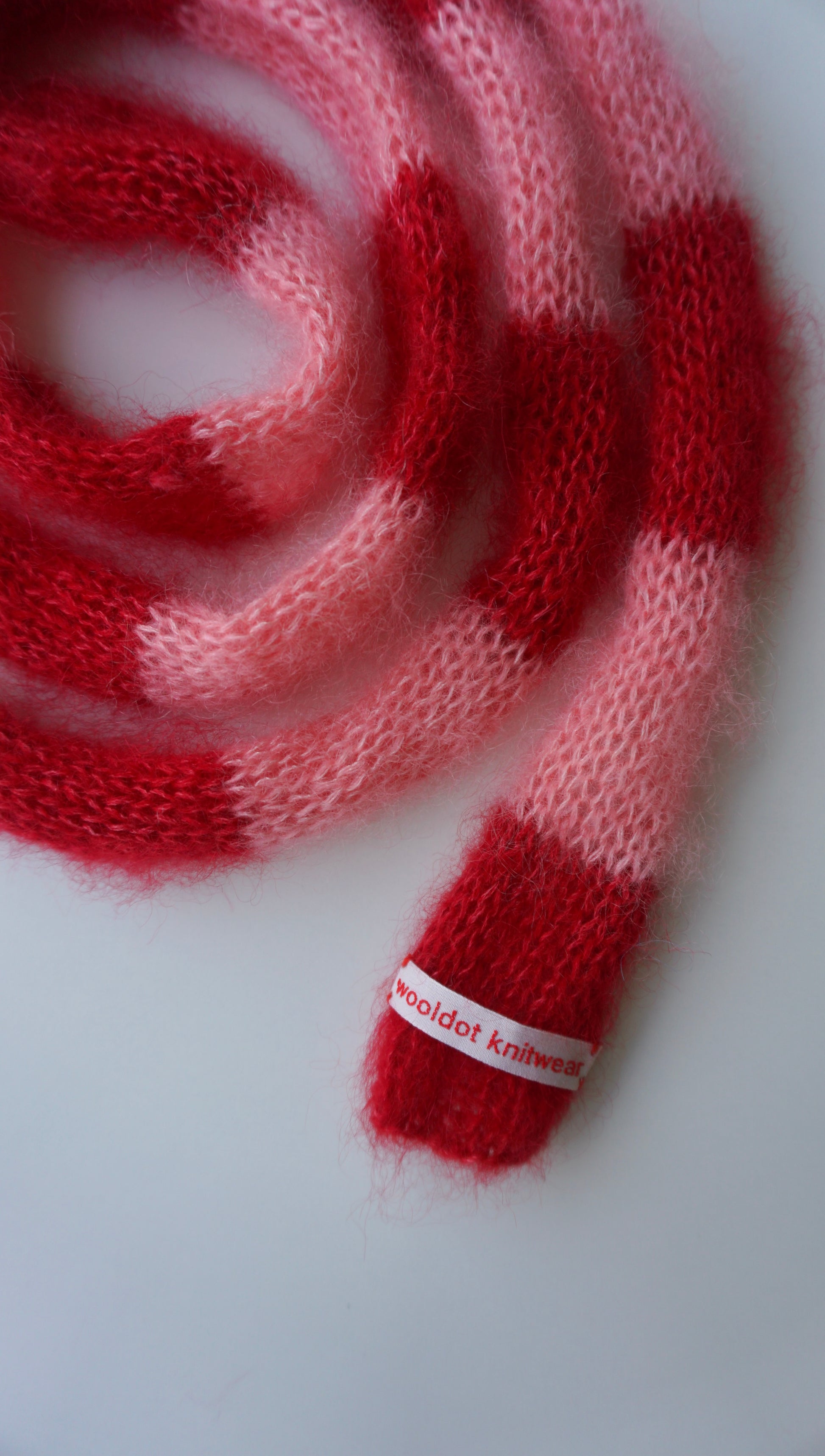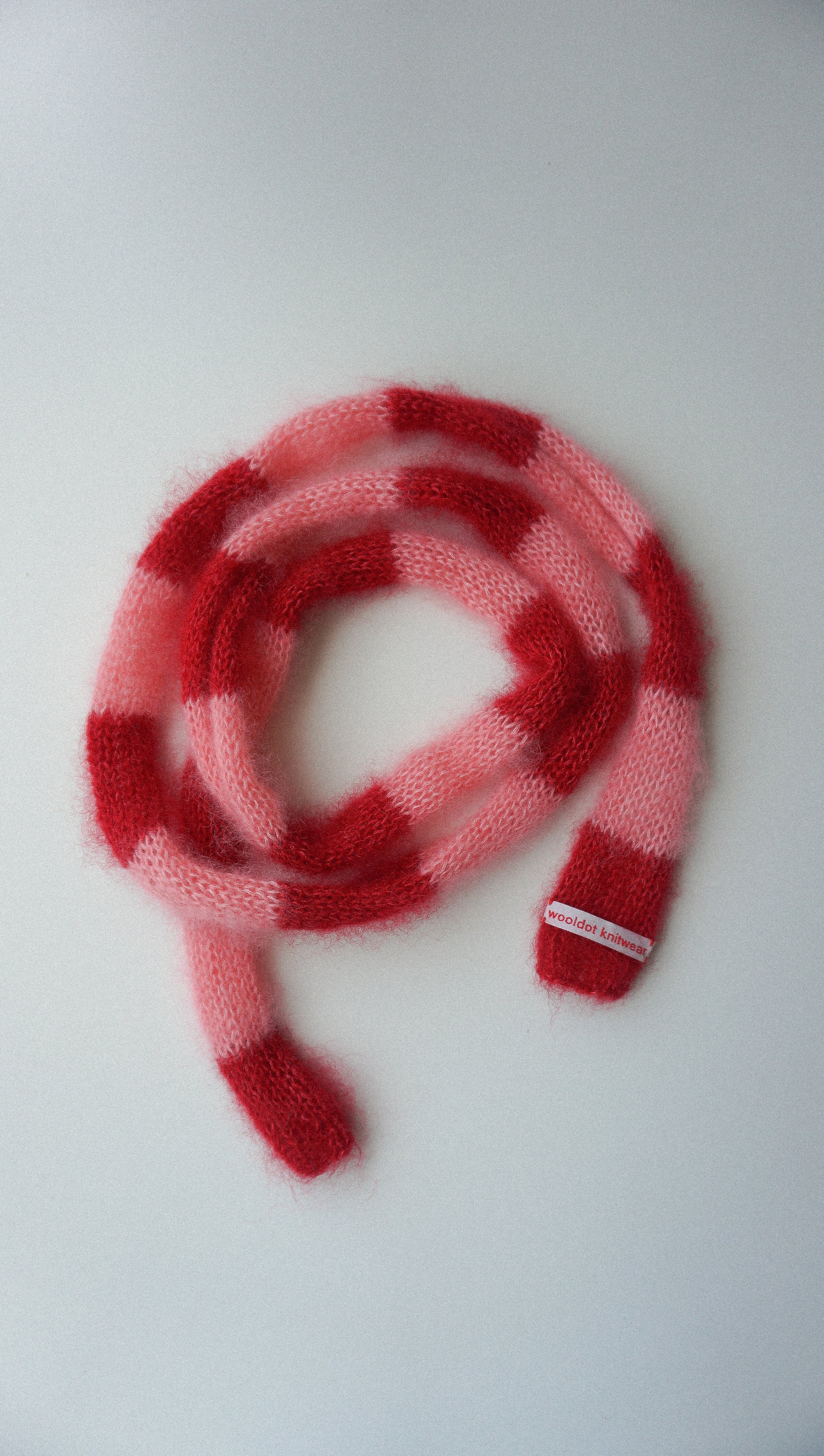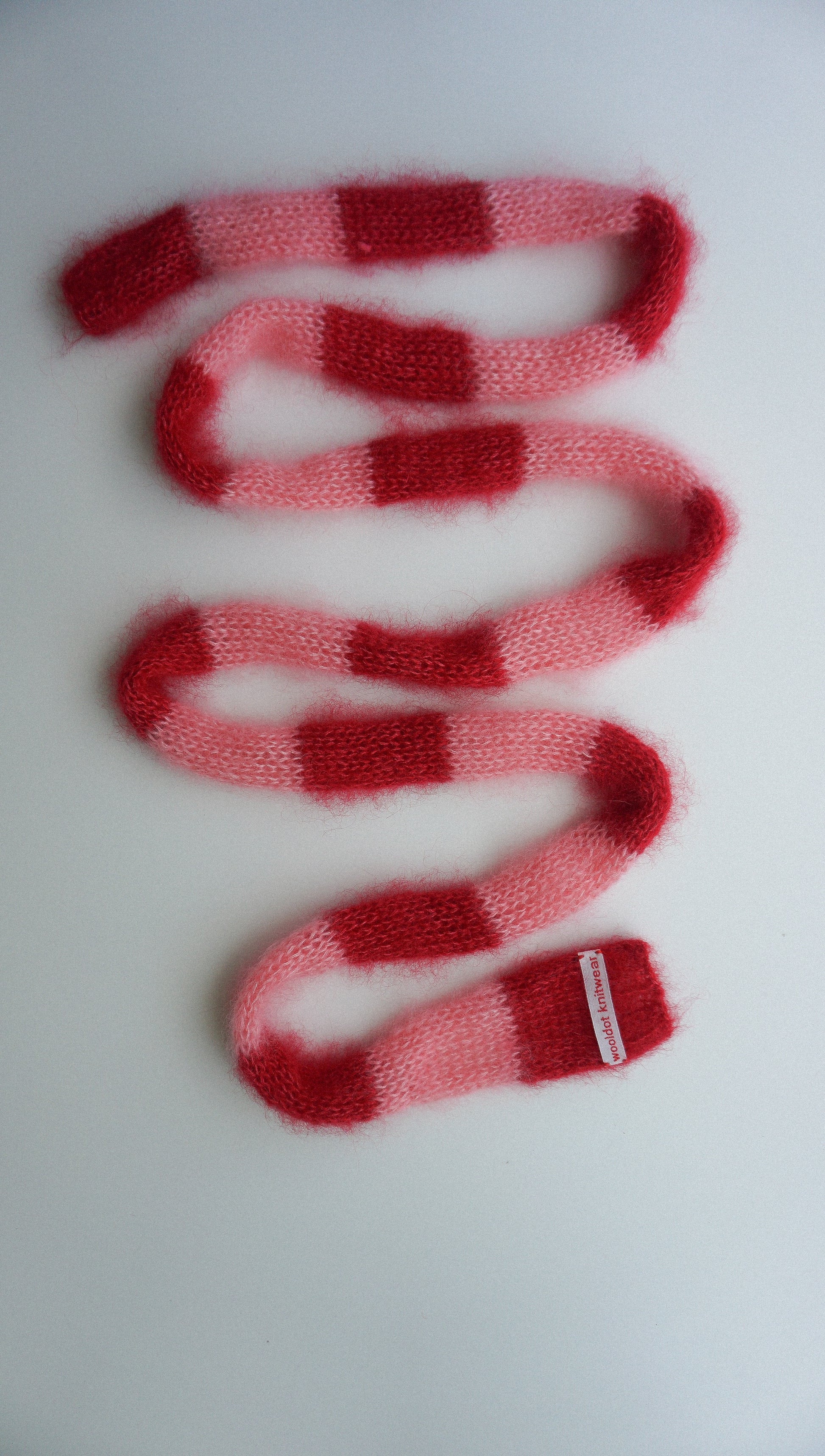 Hand knitted thin soft skinny scarf made of luxurious mohair silk blend (75% mohair, 25% silk). Pink red stripes.