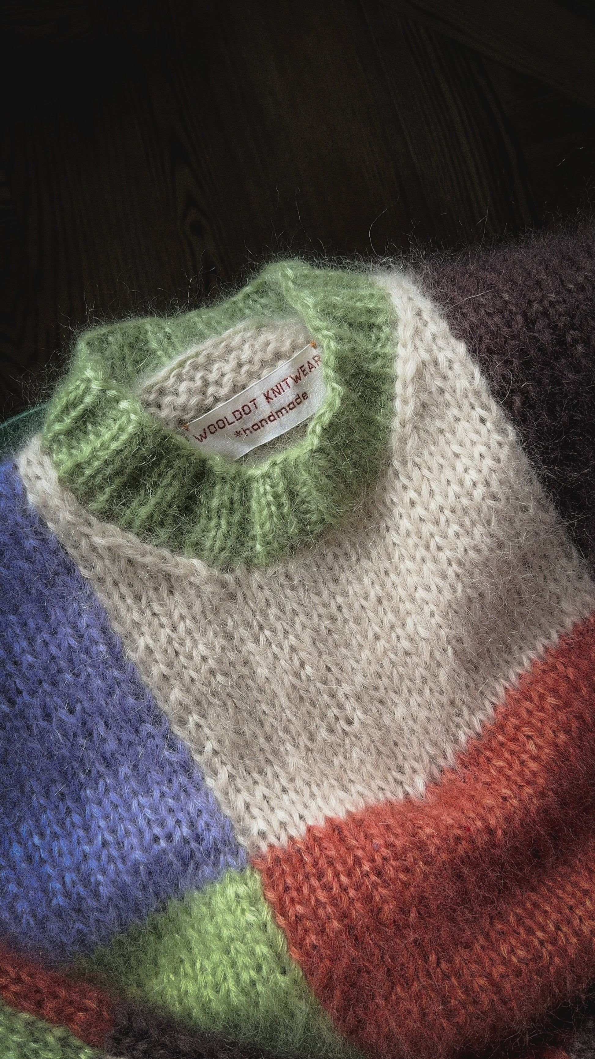 Hand knitted jumper is made from mohair silk blend yarn. Various warm colours, softness and mohair will ensure you will feel warm and cozy. Sweater is oversize, relaxed fit and loose.