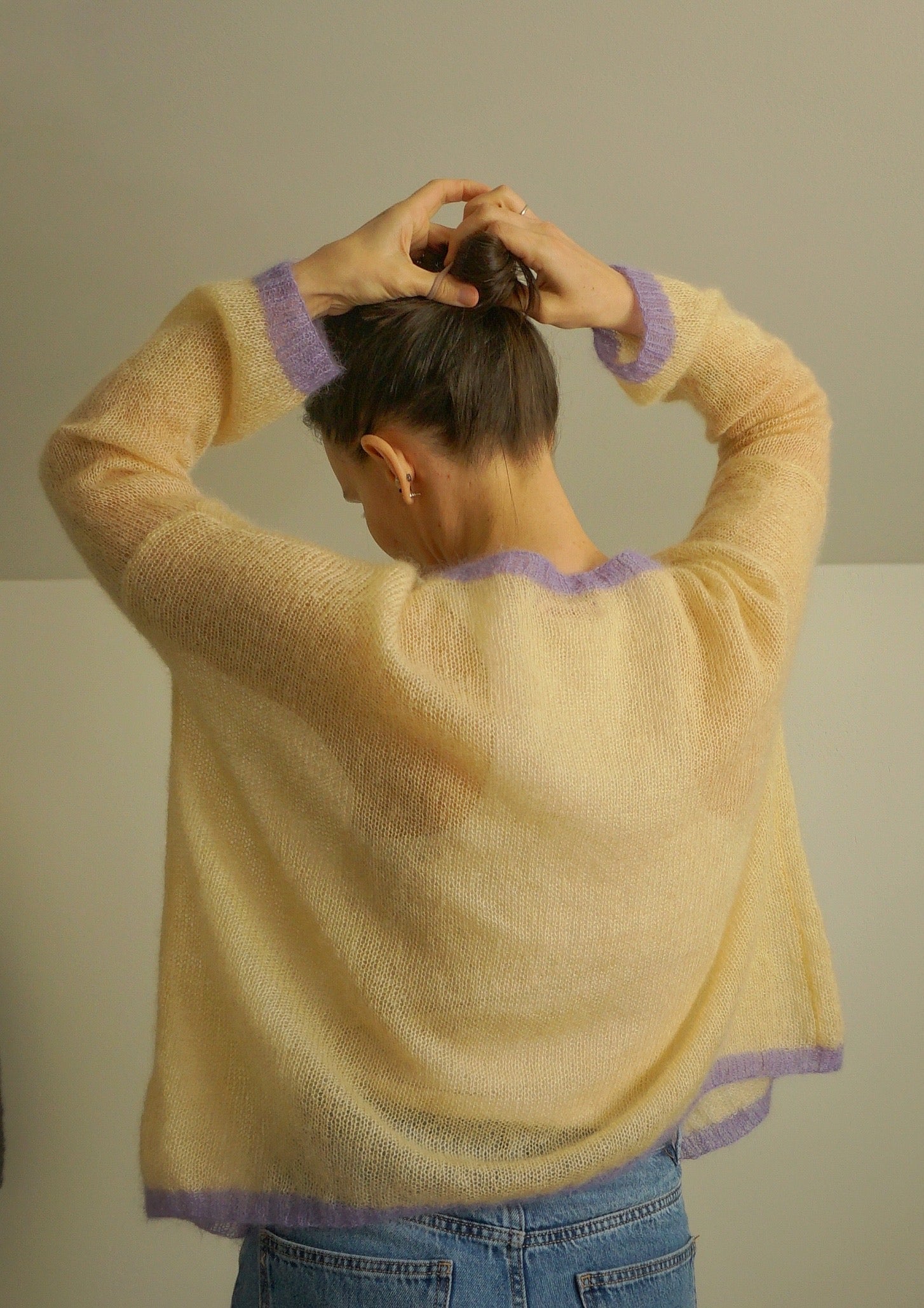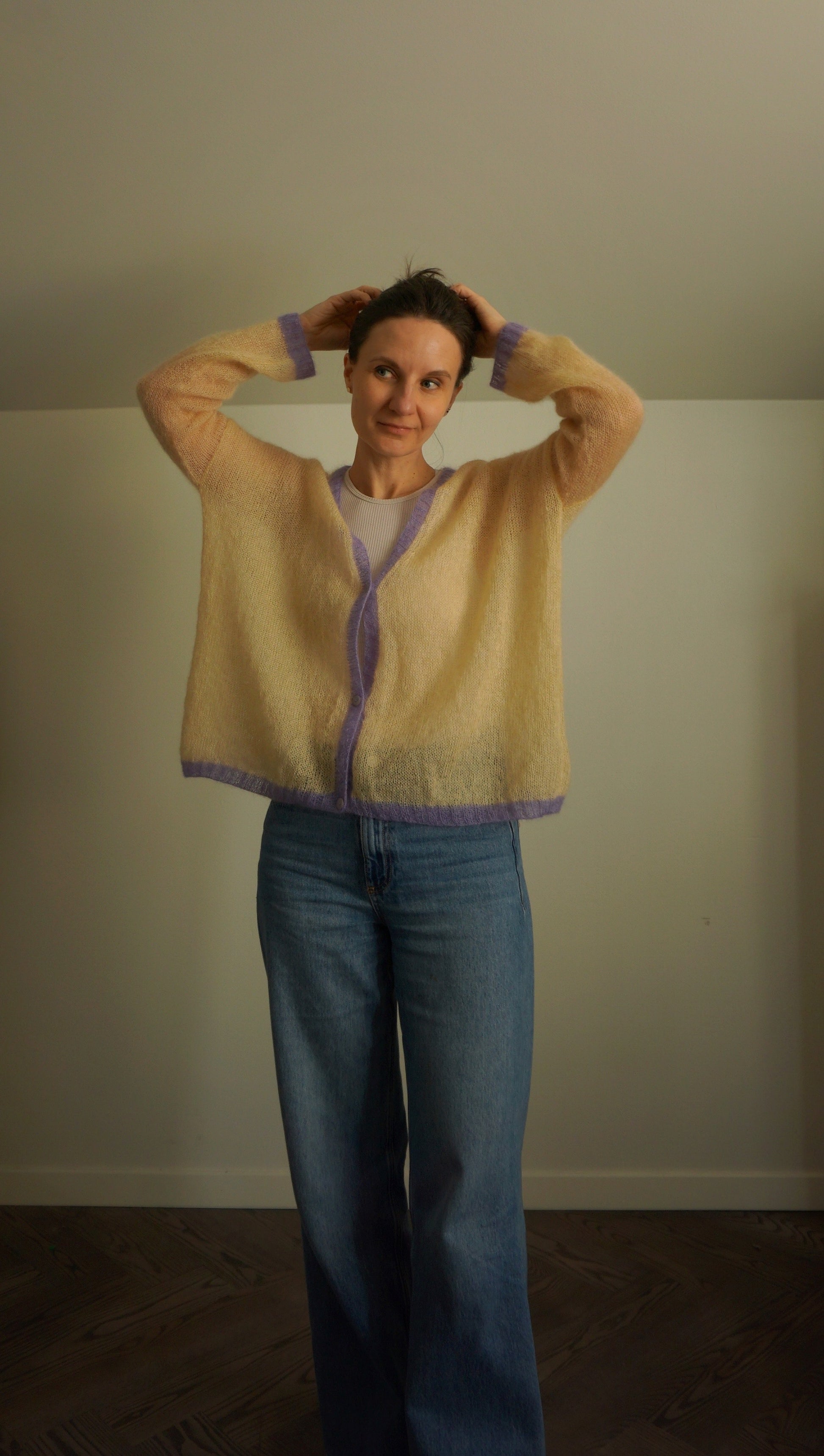 Cardigan is light yellow colour with violet neckline and cuffs. It is buttoned with three little plastic buttons.