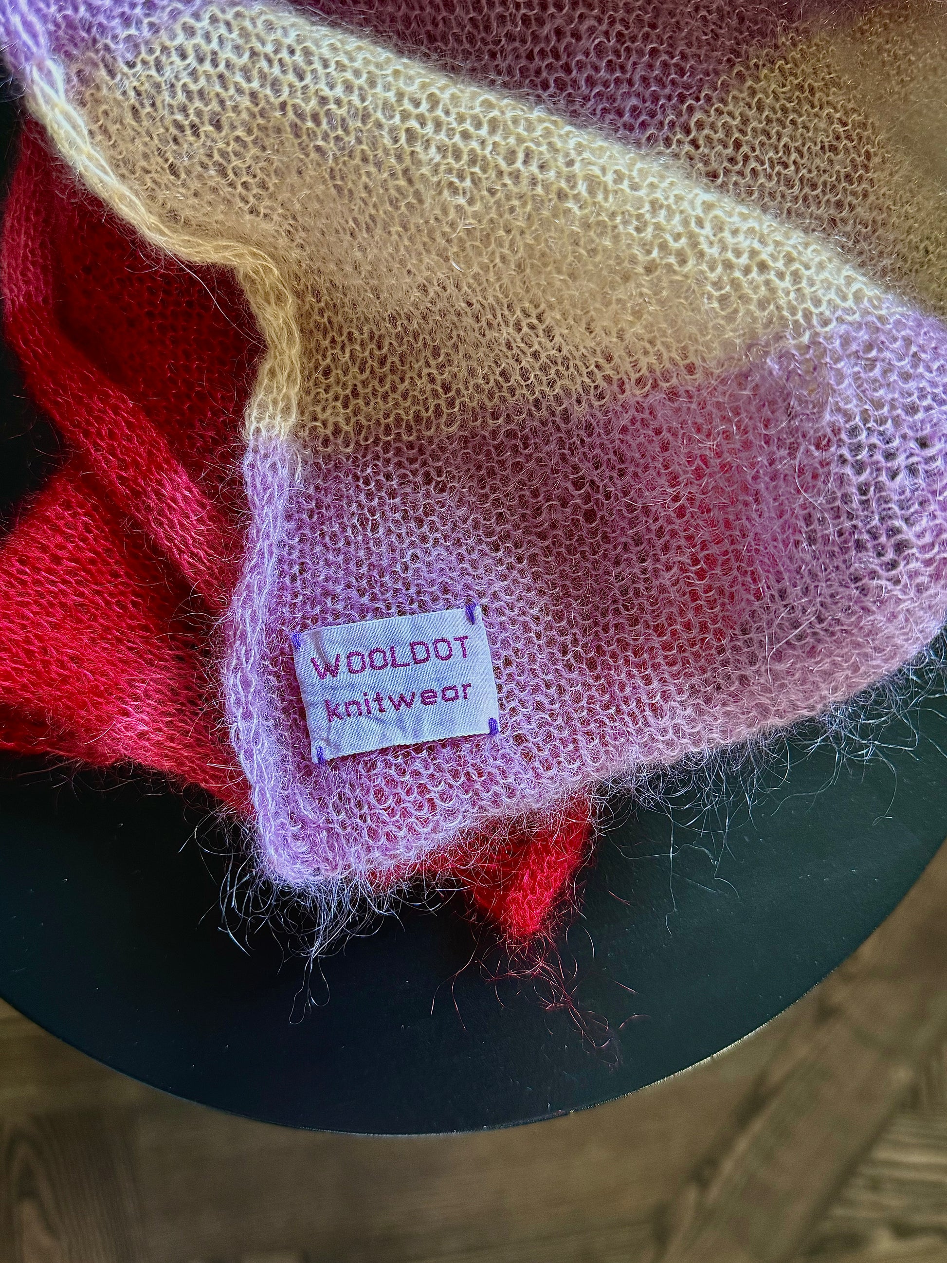 Thin long wide scarf made of luxurious mohair silk blend (75% mohair, 25% silk) yarn in yellow pink and red colours.