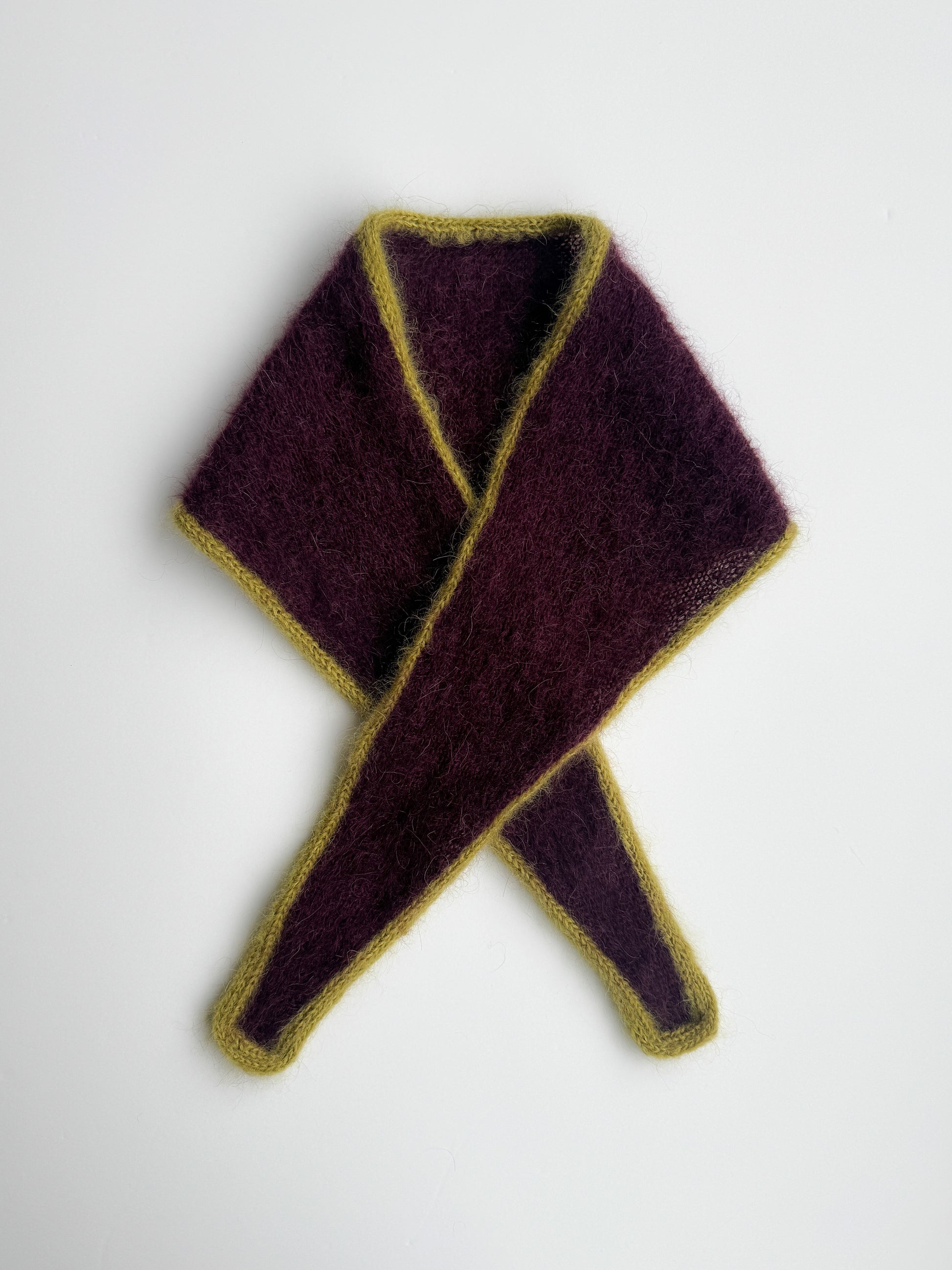 TOMO Bandana—your new go-to accessory for adding warmth and cheer to your day. Lovingly crafted from soft mohair, this cheerful dark aubergine bandana with its charming green trim feels as wonderful as it looks.