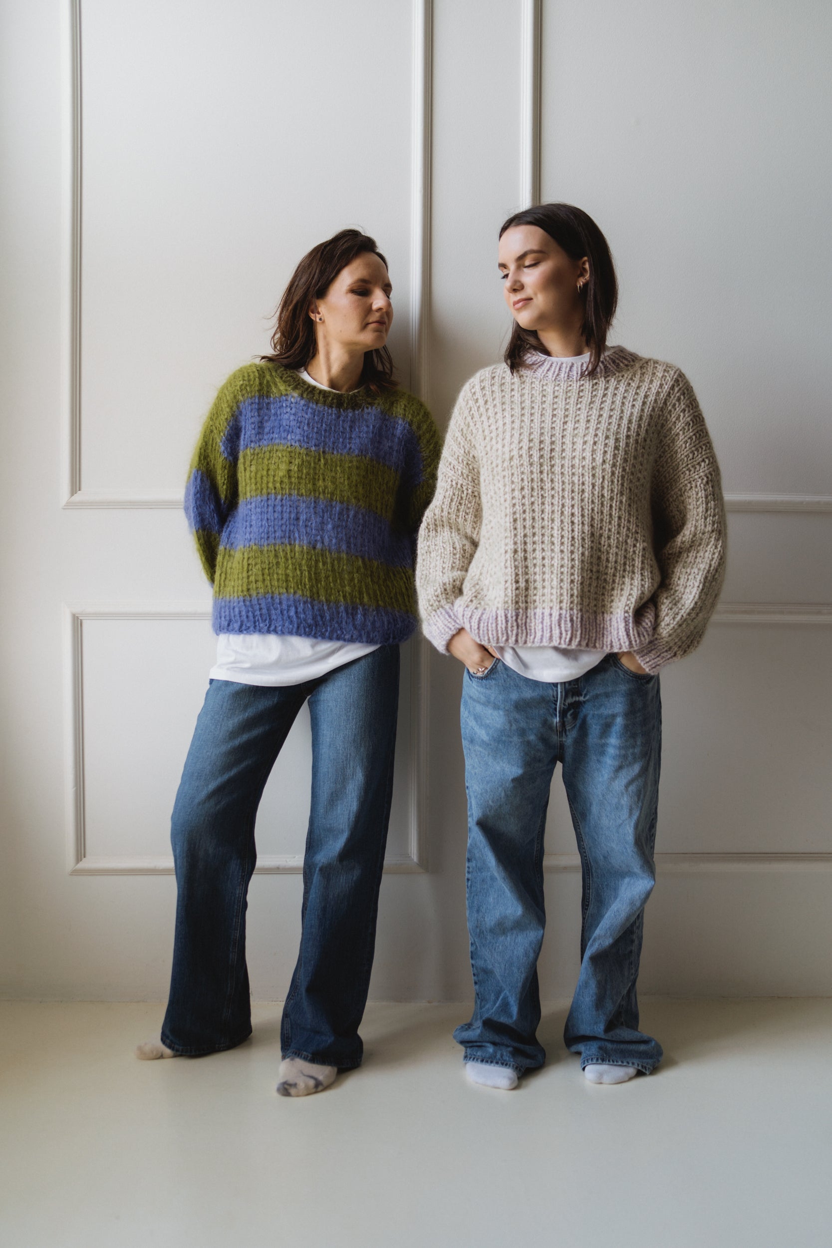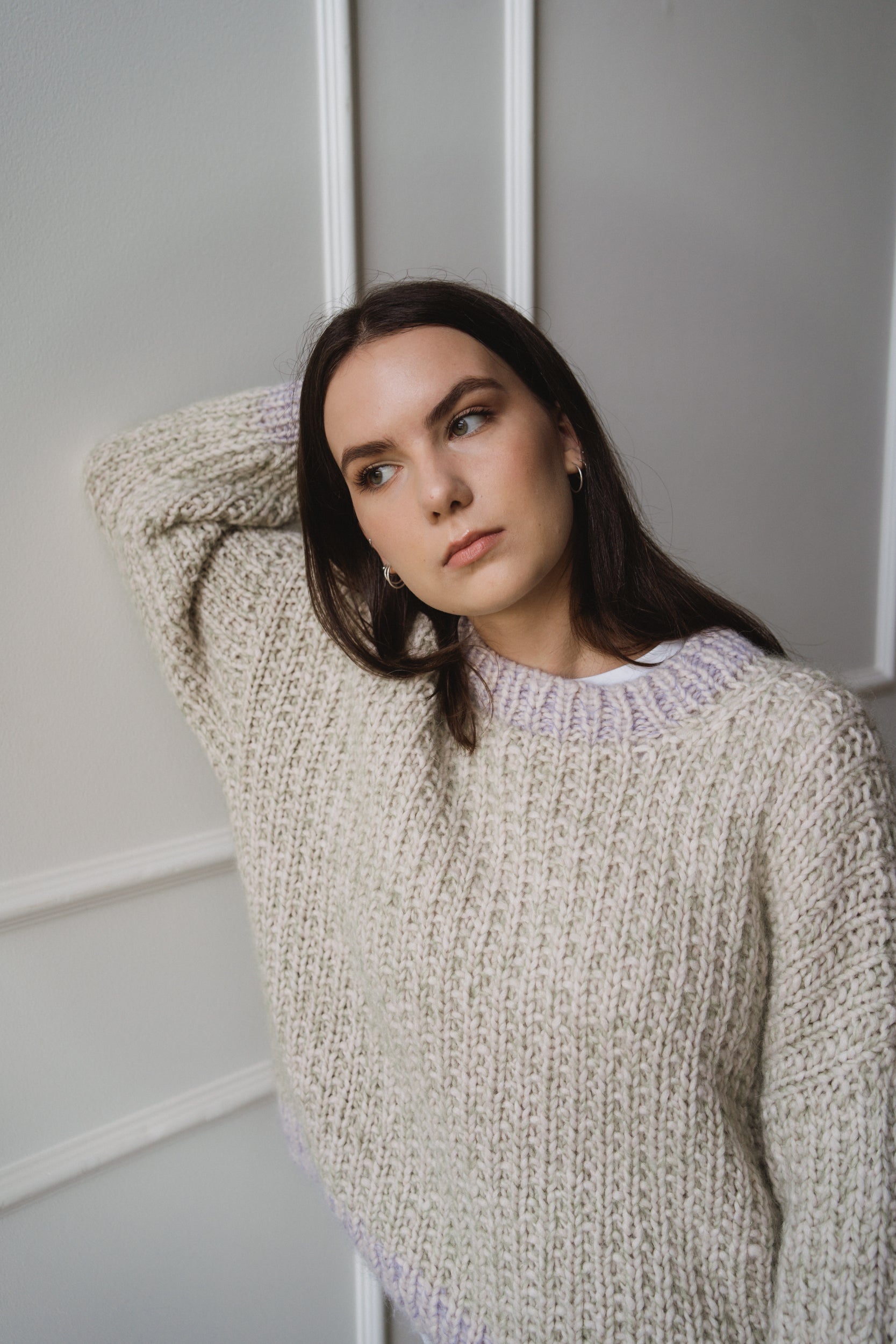 Knitted sweater is made from alpaca, wool, cotton, mohair and silk blend yarn. It is white with the shade of green for body and violet for the cuffs and neckline.