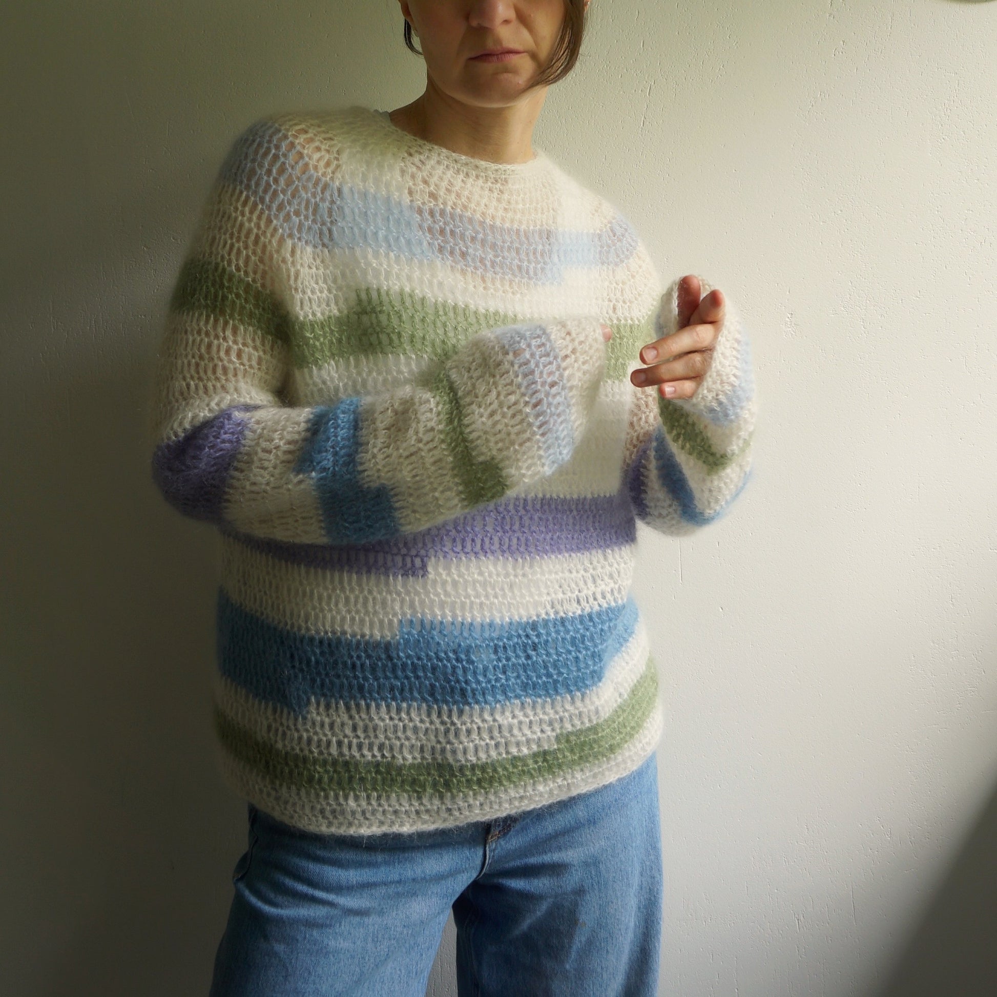 White crochet mohair sweater with stripes